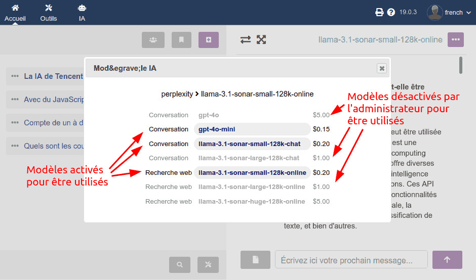• Interface multi-IA : ce module intègre la connexion par API aux services d'IA de différents fournisseurs pour différents usages. Chat conversationnel, recherche sur internet, génération d'images, transcription audio (prochainement), etc. De plus, l'utilisateur peut changer d'IA au milieu d'une conversation, autant de fois que nécessaire !