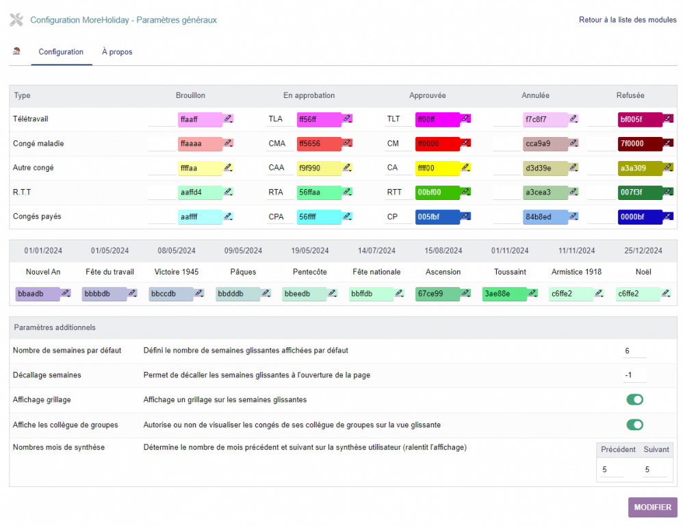 Permet de définir des couleurs et des abréviations pour chaque type et statut de congé, ainsi que pour les jours fériés, afin d'adapter l'affichage aux préférences de l'entreprise.