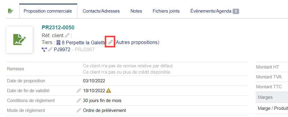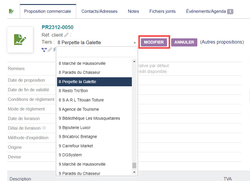 Modify one-click thirdparties on a quote, an order, an invoice and / or a shipping page. You can change the custumers and suppliers in documents.