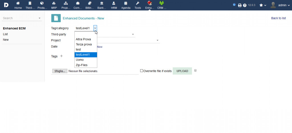 Comme dans le module standard, ce module permet le téléchargement de documents manuels, mais, en plus, ces documents, comme tout autre document généré automatiquement par Dolibarr, peuvent être classés en catégories et associés à une ou plusieurs balises.