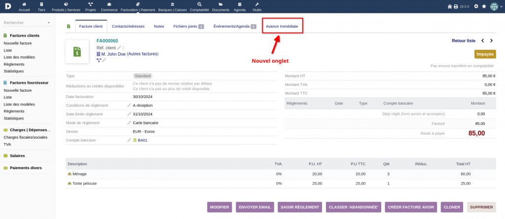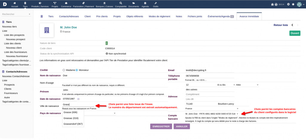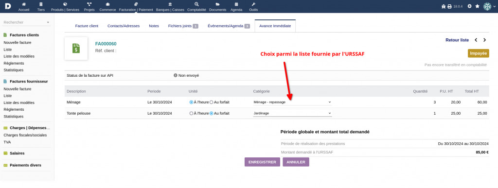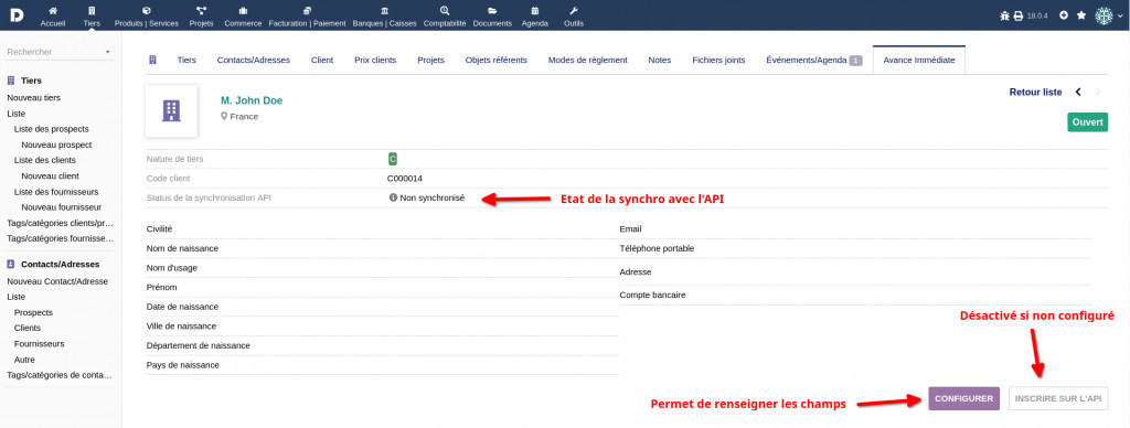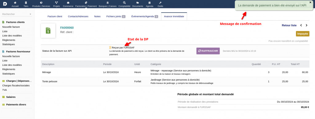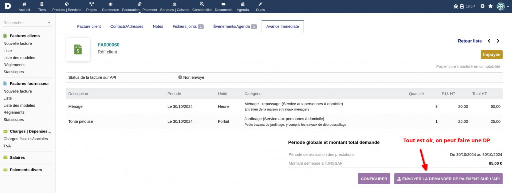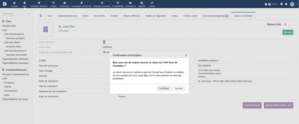 This module connects to the API Tiers de Prestation for the immediate advance of tax credits on client invoices for personal services. You need a free login to use this plugin (https://api.gouv.fr/les-api/api-tiers-de-prestation/demande-acces)