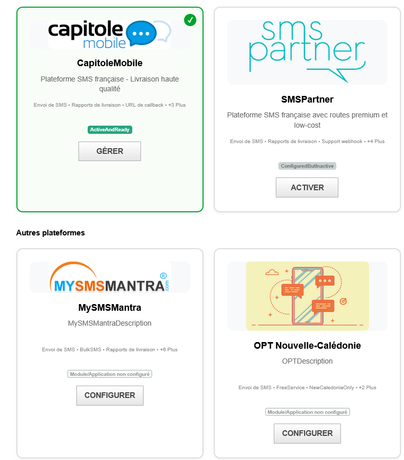 Anbieter inklusive:Twilio (USA, Global), OVH Cloud (France, EU), SMSFactor (France), CapitoleMobile (France), SMSPartner (France, EU), ClickSend (Australia, Global), LabsMobile (Spain, Global), Seven.io (Germany, EU), Infobip (Global), Keyyo (France), LWS (France,Belgium), MySMSMantra (India)...