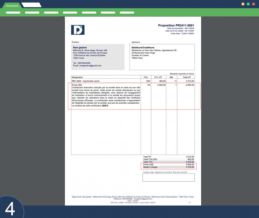 Principales fonctionnalités : - Déduction des primes : Le montant de la prime est calculé et déduit directement du total TTC des devis et factures. - Champ modifiable : Le montant de la prime peut être saisi et ajusté via un champ modifiable intégré à l'interface Dolibarr. - Texte pré-défini sur les documents : La prime est accompagnée d’un texte standardisé, qui est automatiquement ajouté dans les devis et factures, assurant une cohérence documentaire. - Intégration fluide : Ce module s’intègre parfaitement avec les modules de gestion des devis et factures, offrant une expérience utilisateur fluide.