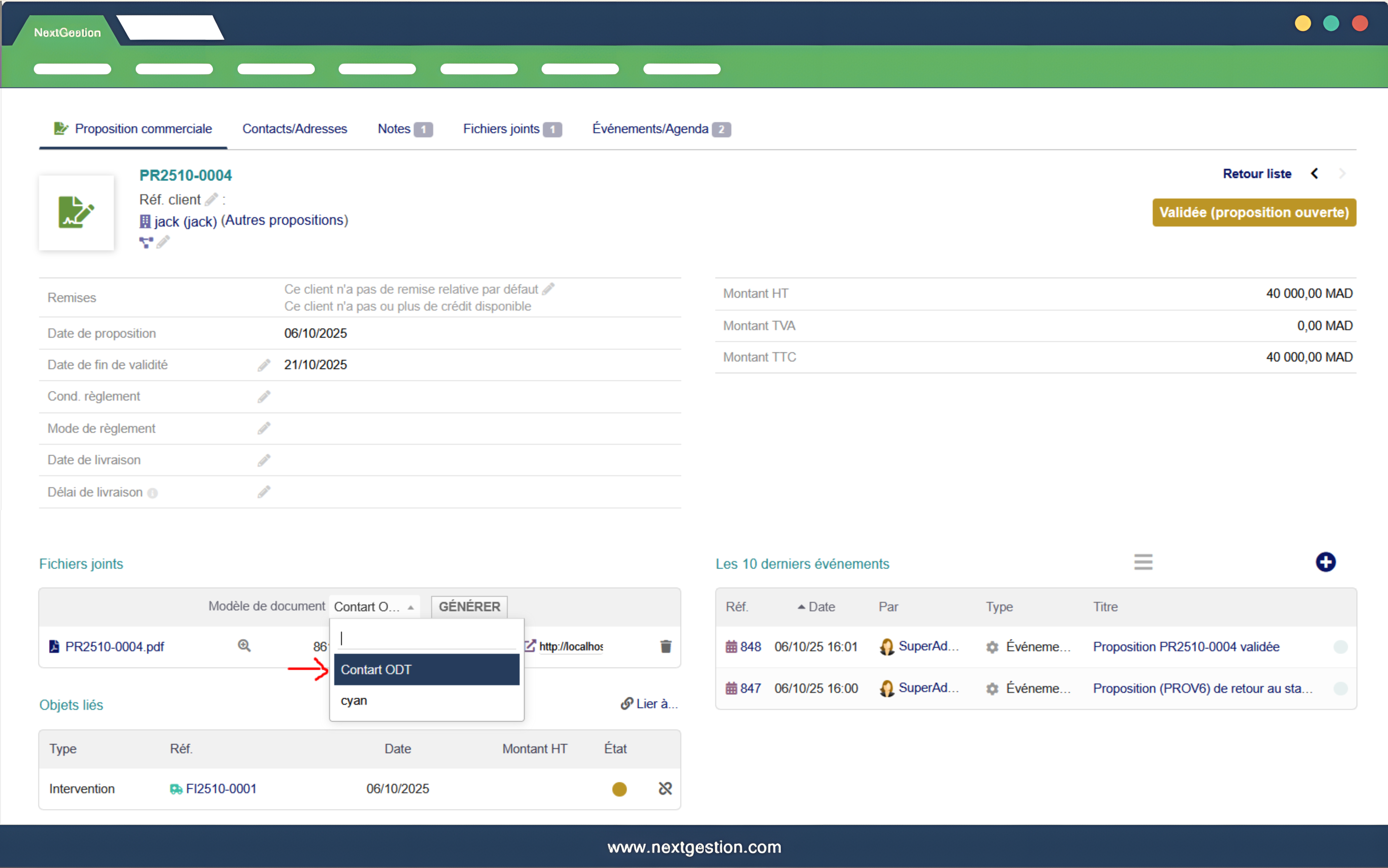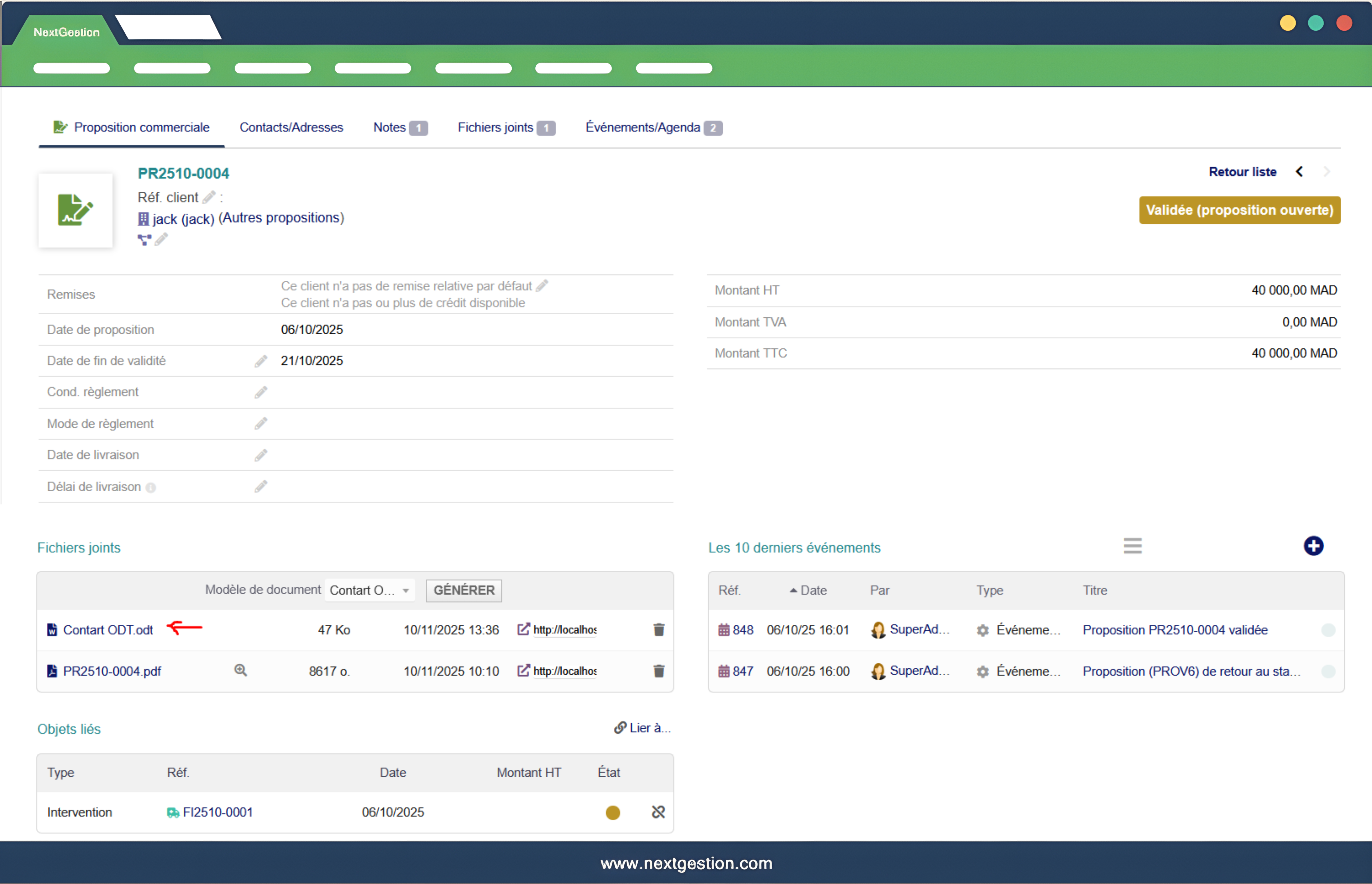 Allgemeine BeschreibungDas Modul „ODT/PDF-Vertrag aus Angebot“ für Dolibarr ermöglicht es, automatisch individuelle Verträge im ODT-Format (und konvertierbar in PDF) aus kommerziellen Angeboten zu erzeugen. Auf Basis einer in Ihrem Textverarbeitungsprogramm erstellten Vertragsvorlage (LibreOffice, MS Word mit ODT-Kompatibilität usw.) führt das Modul einen Seriendruck mit den Angebotsdaten durch und erzeugt einen fertig ausgefüllten Vertrag, der direkt an der Angebotskarte als Anhang abgelegt wird. Ziele des ModulsStandardisierung Ihrer Vertragsvorlagen und Geschäftsbedingungen aus einer zentralen Referenz. Funktionsweise für AnwenderAuf der Karte Kommerzielle Angebotsanfrage/Proposition erscheint in der Zone Verknüpfte Dateien ein neuer Block: