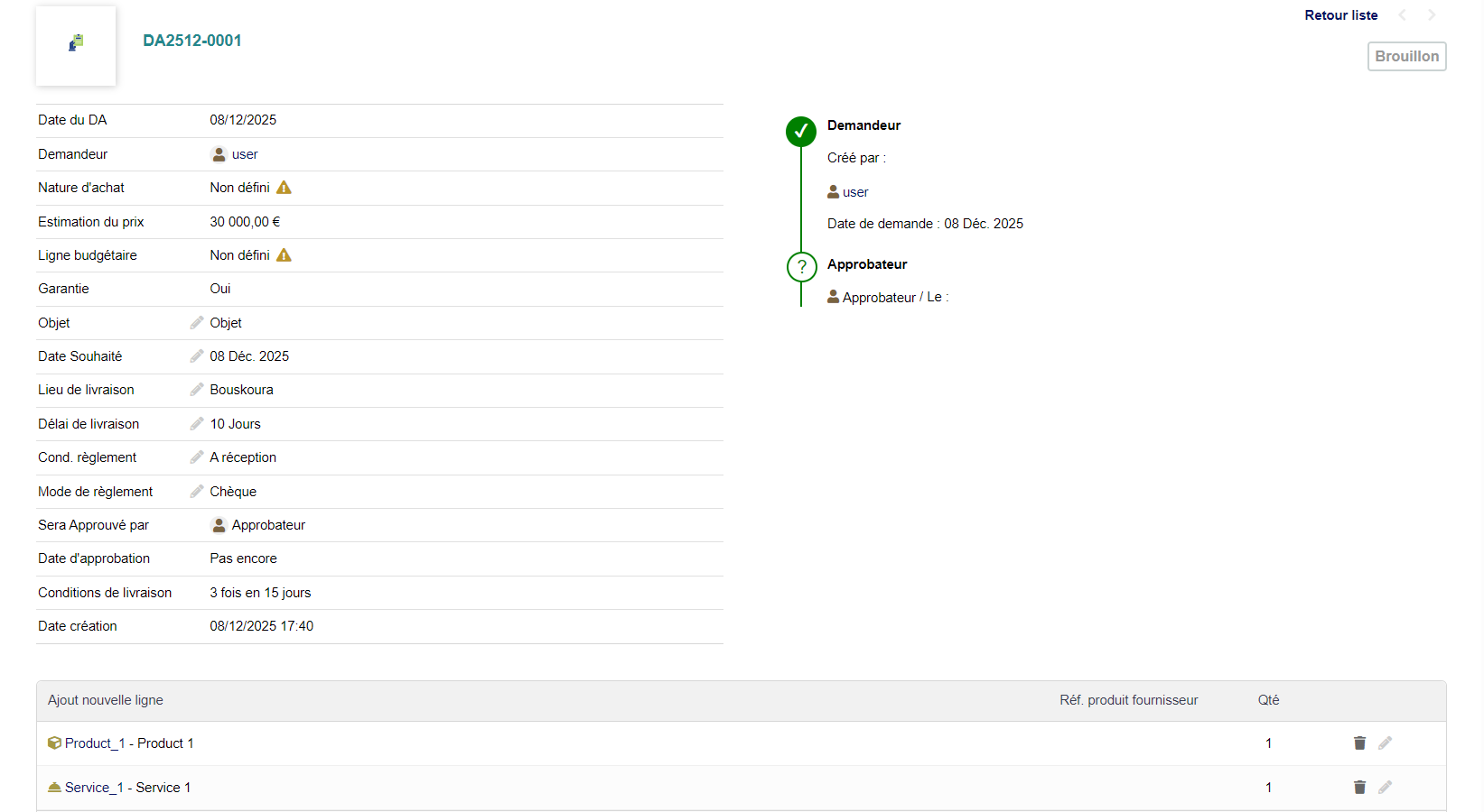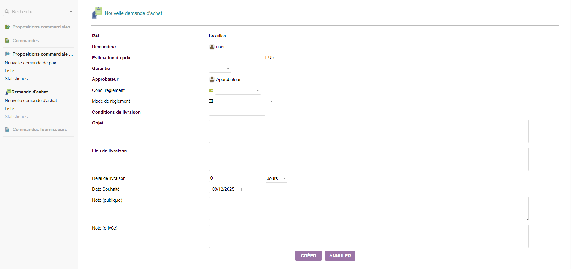 Create purchase requests with reference, subject, project, estimated amount, delivery place and desired delivery date.