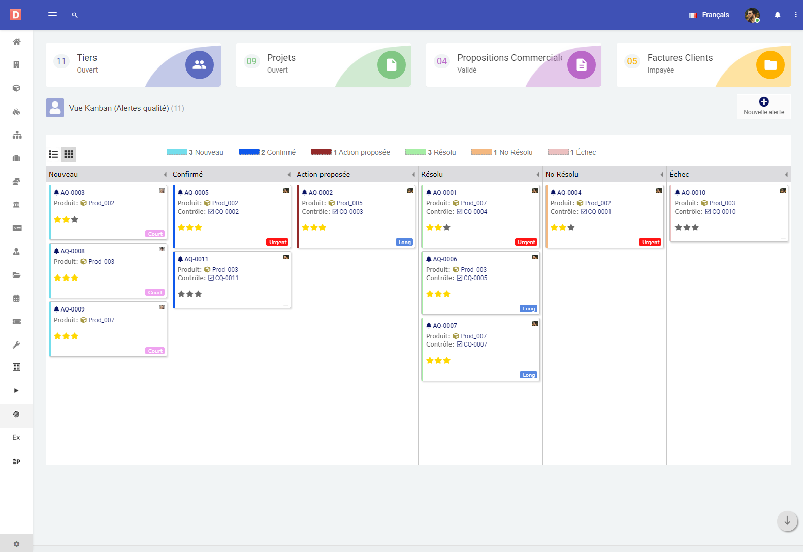 Le encantará organizar sus alertas de calidad en la vista Kanban en Dolibarr. Arrastre y suelte alertas para resaltar el progreso y use indicadores visuales para resaltar alertas críticas.