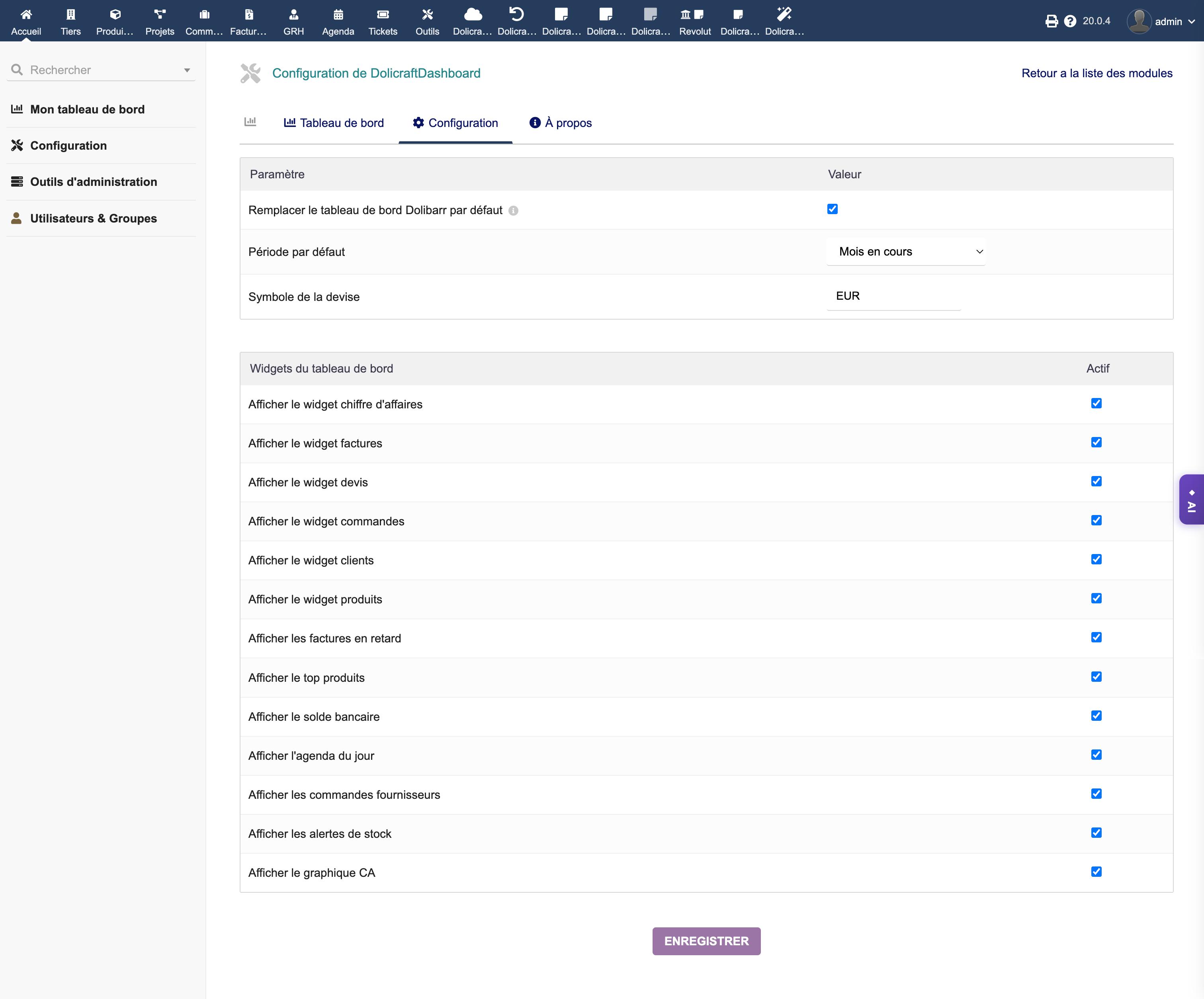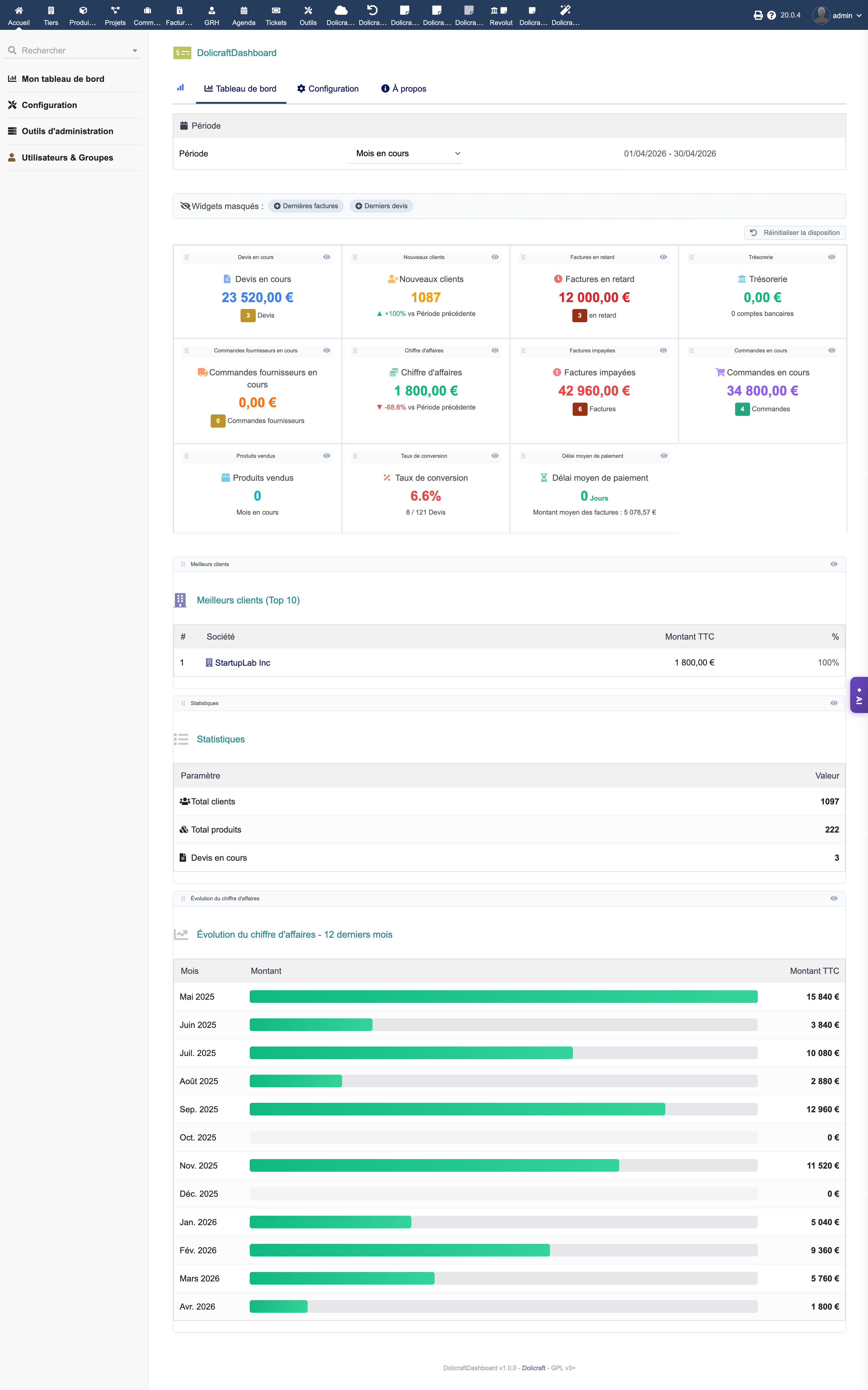 Ein vollständiges und anpassbares Dashboard zur Steuerung Ihrer Geschäftstätigkeit. DolicraftDashboard ersetzt oder ergänzt das native Dolibarr-Dashboard mit 19 konfigurierbaren Widgets, Drag-and-Drop-Neuanordnung und individuellen Benutzereinstellungen.