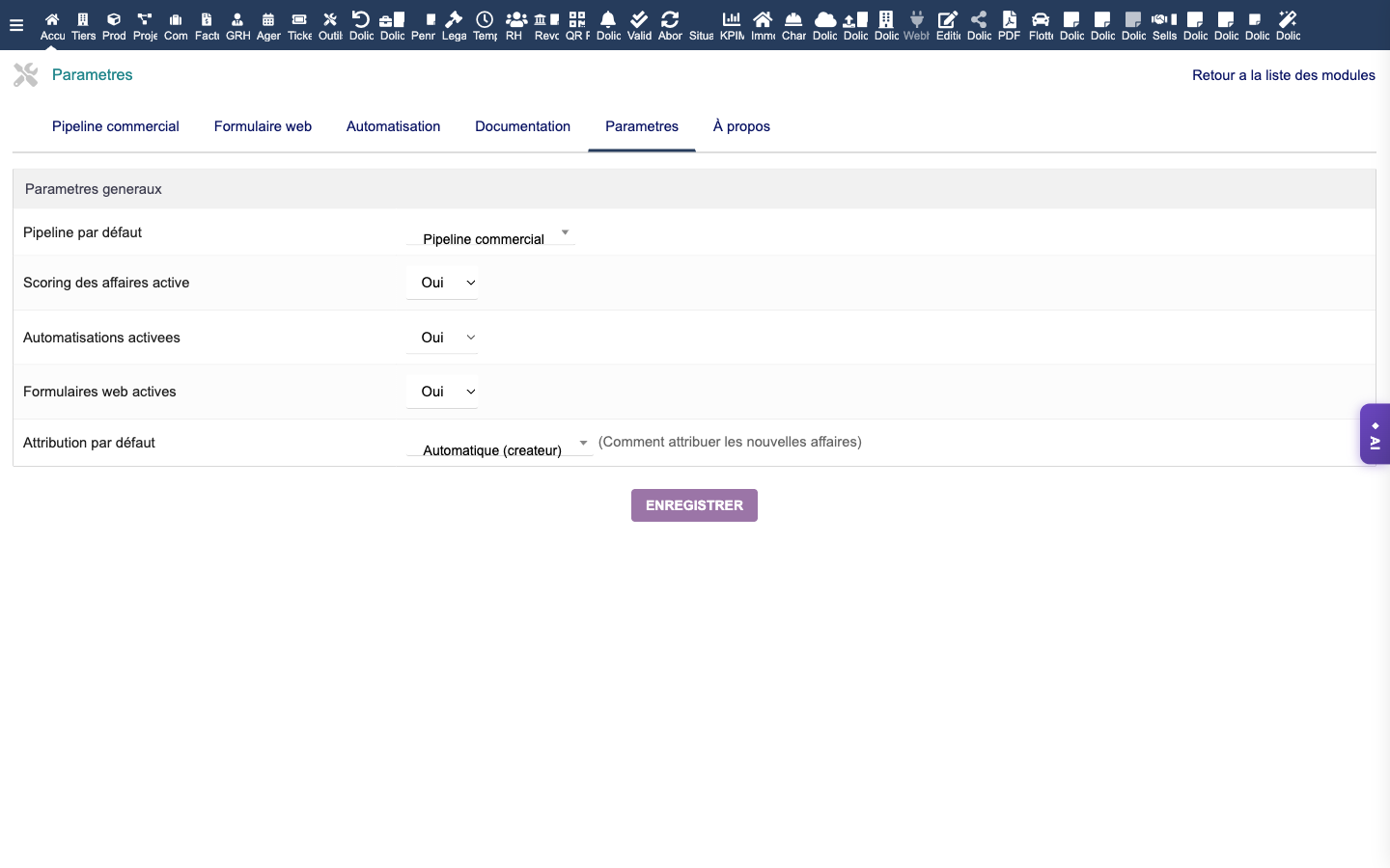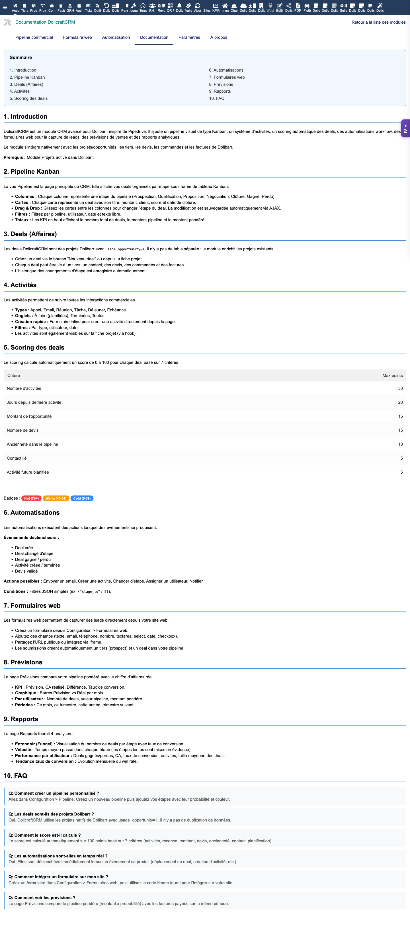 Le CRM avance pour Dolibarr. Pipeline kanban drag-and-drop, scoring automatique des leads, automatisations configurables, previsions commerciales, formulaires web publics, rapports et analyses. Integration native Dolibarr - pas de sync, pas de double saisie. Transformez votre ERP en outil de pilotage commercial complet.