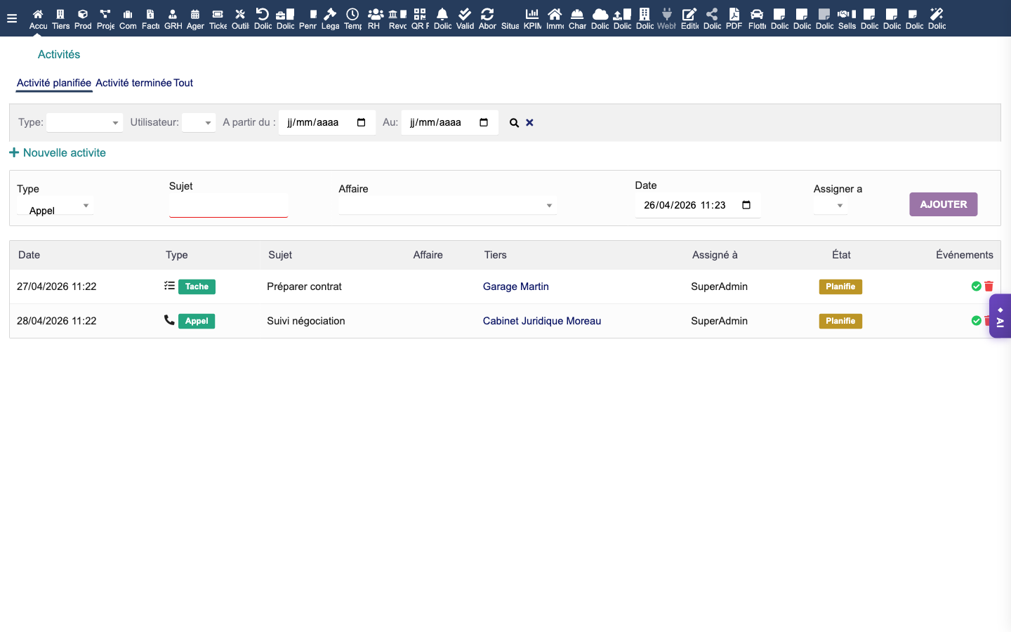 Planifiez et suivez toutes vos activites commerciales : appels, emails, rendez-vous, taches, demos. Chaque activite rattachee a un deal et/ou un tiers. Vue par commercial, par tiers, par periode. Rappels automatiques.