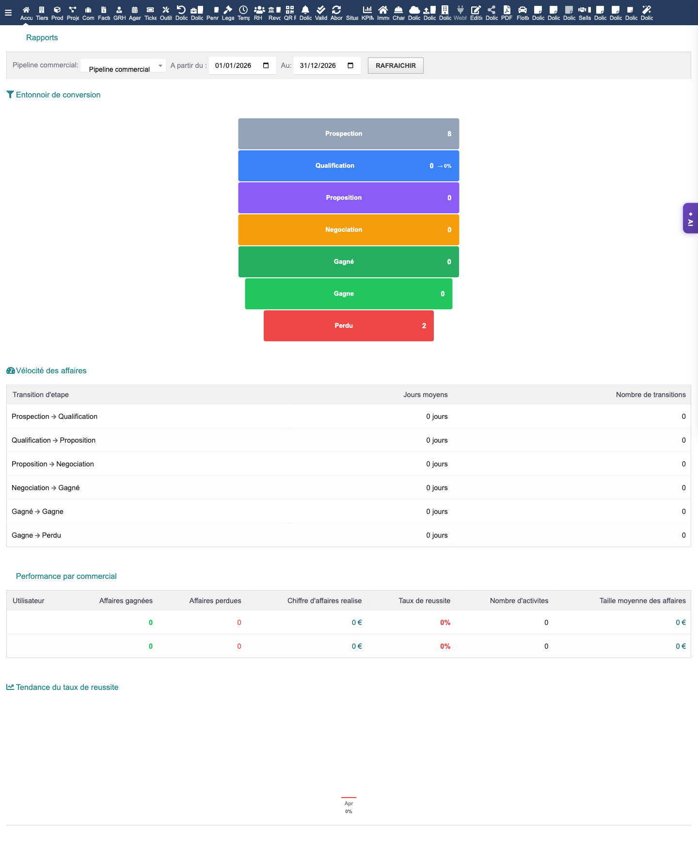 Transformez Dolibarr en outil de pilotage commercial complet. Dolibarr est un excellent ERP, mais son CRM natif reste basique : des opportunites dans une liste, pas de pipeline visuel, pas de scoring, pas d'automatisation, pas de previsions. Les equipes commerciales qui veulent un vrai outil de pilotage finissent par sortir de Dolibarr vers Pipedrive, HubSpot ou Monday, puis a ressaisir les ventes dans l'ERP.
