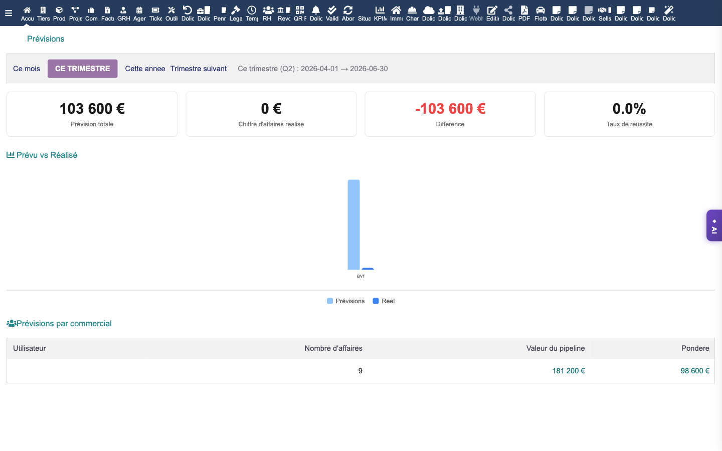 Previsionnel pondere par la probabilite de closing de chaque deal. Vue mensuelle, trimestrielle, annuelle. Comparaison realise vs prevu. Filtrable par commercial, pipeline, periode.