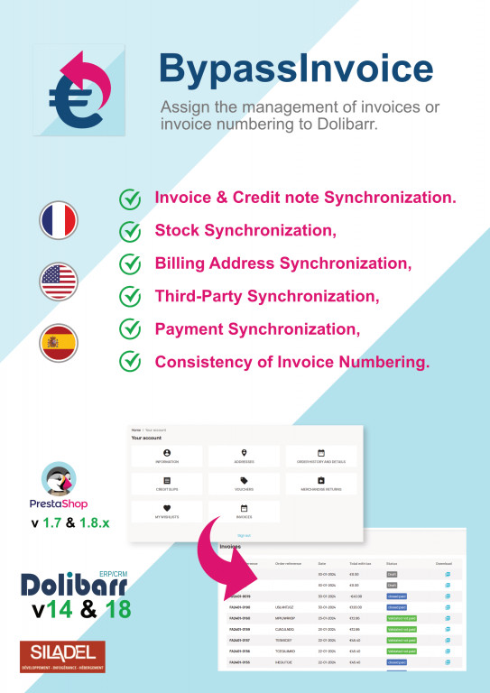 BypassInvoice allows for the delegation of the management and numbering of PrestaShop invoices to Dolibarr, simplifying billing and data synchronization, and offering an efficient solution for merchants looking to optimize their accounting processes and provide a better customer experience.