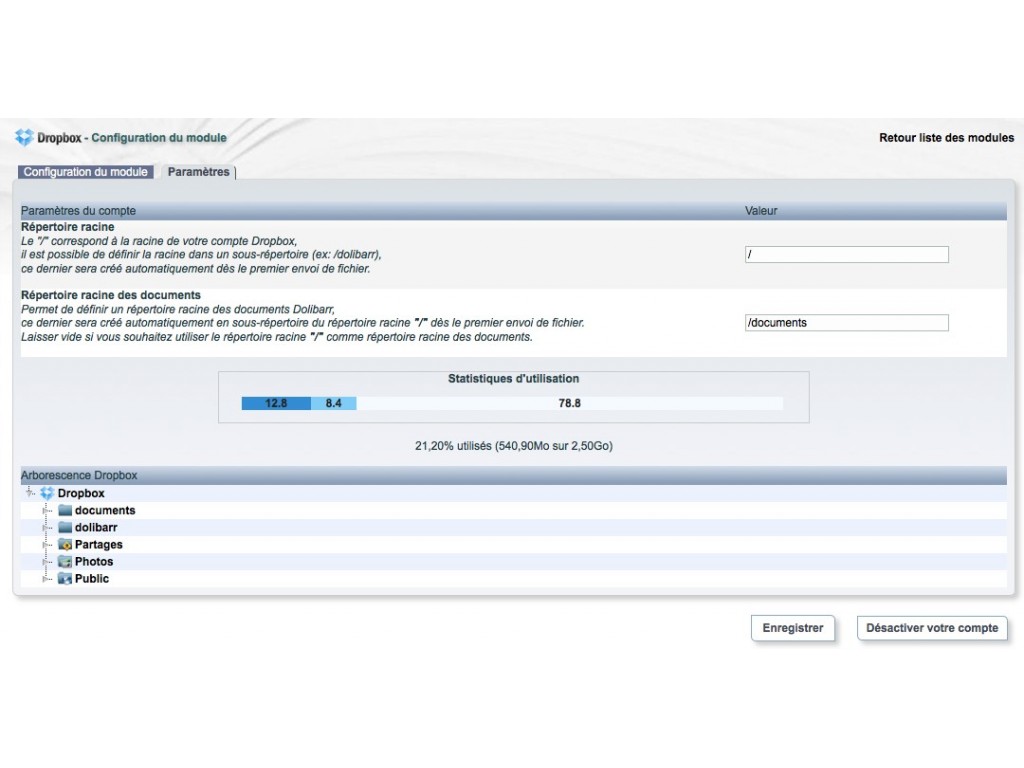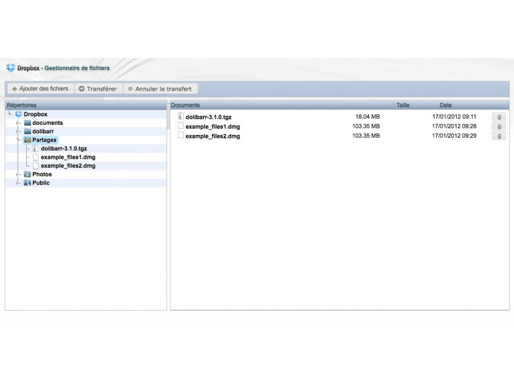 Dieses Modul ermöglicht es Ihnen, Ihrem Dropbox-Konto mit Dolibarr verknüpfen. Es erstellt ein Verzeichnis für die Kunden und synchronisiert alle erzeugten und hochgeladenen Dokumente. Dazu gehört auch die Möglichkeit, mehrere Dateien auf einmal hochladen. Das gibt Ihnen ein Dokumentenmanagement von Client bei Deiner Post synchronisiert.