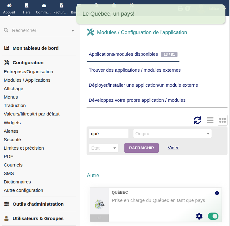 Professional Dolibarr menu reorganization with clear business area separation, drag-and-drop ordering and per-user customization.