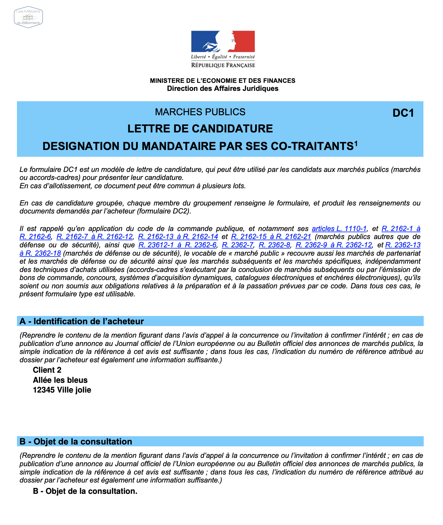 Erstellen Sie offizielle französische DC1-Bewerbungsformulare direkt aus Dolibarr-Angeboten, unterschriftsreif und in der Angebotskarte archiviert.