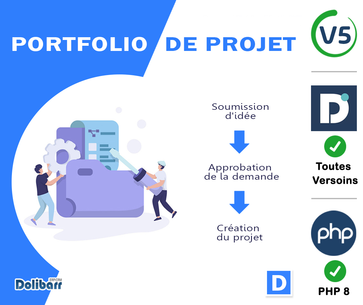 The Project Portfolio module adds a dedicated space in Dolibarr for managing, tracking, and approving projects within the organization. It provides a global view of all project requests, their progress, budgets, and the users involved. This module is particularly suited for companies that want to centralize their internal or external project management in a modern and intuitive interface.