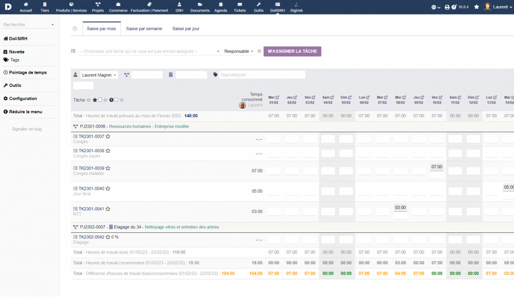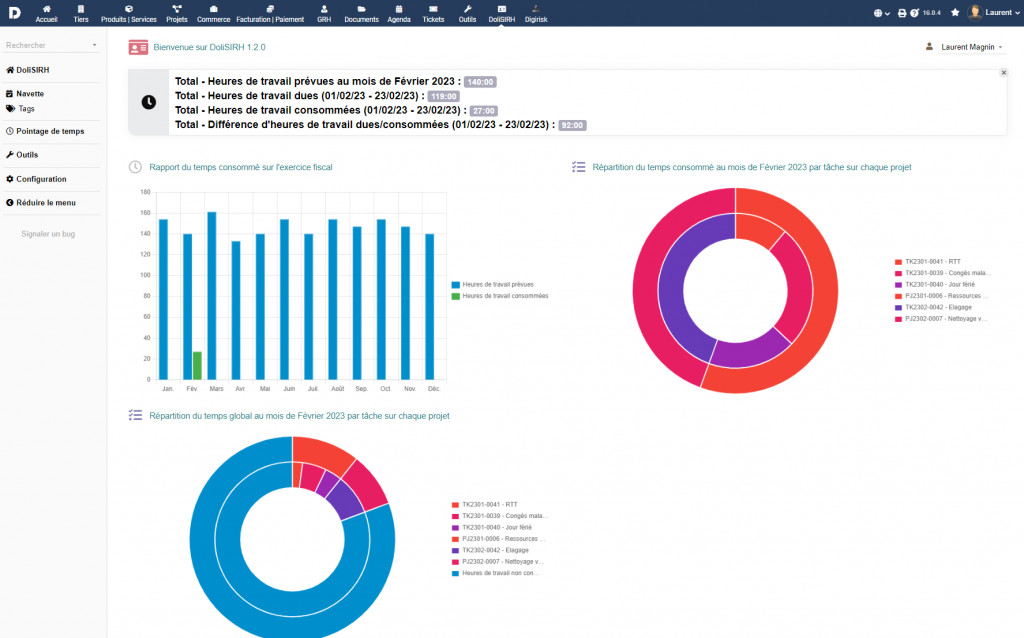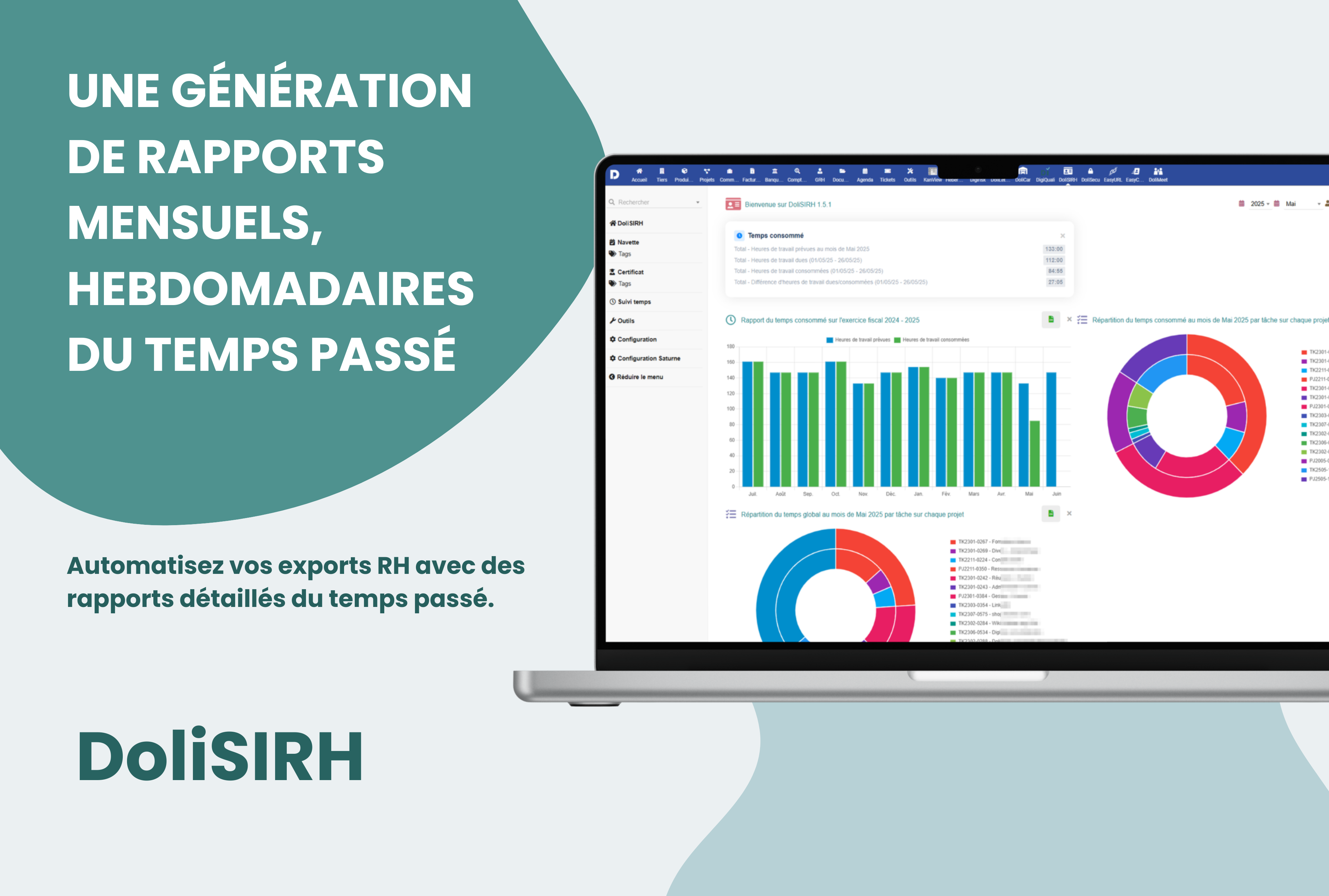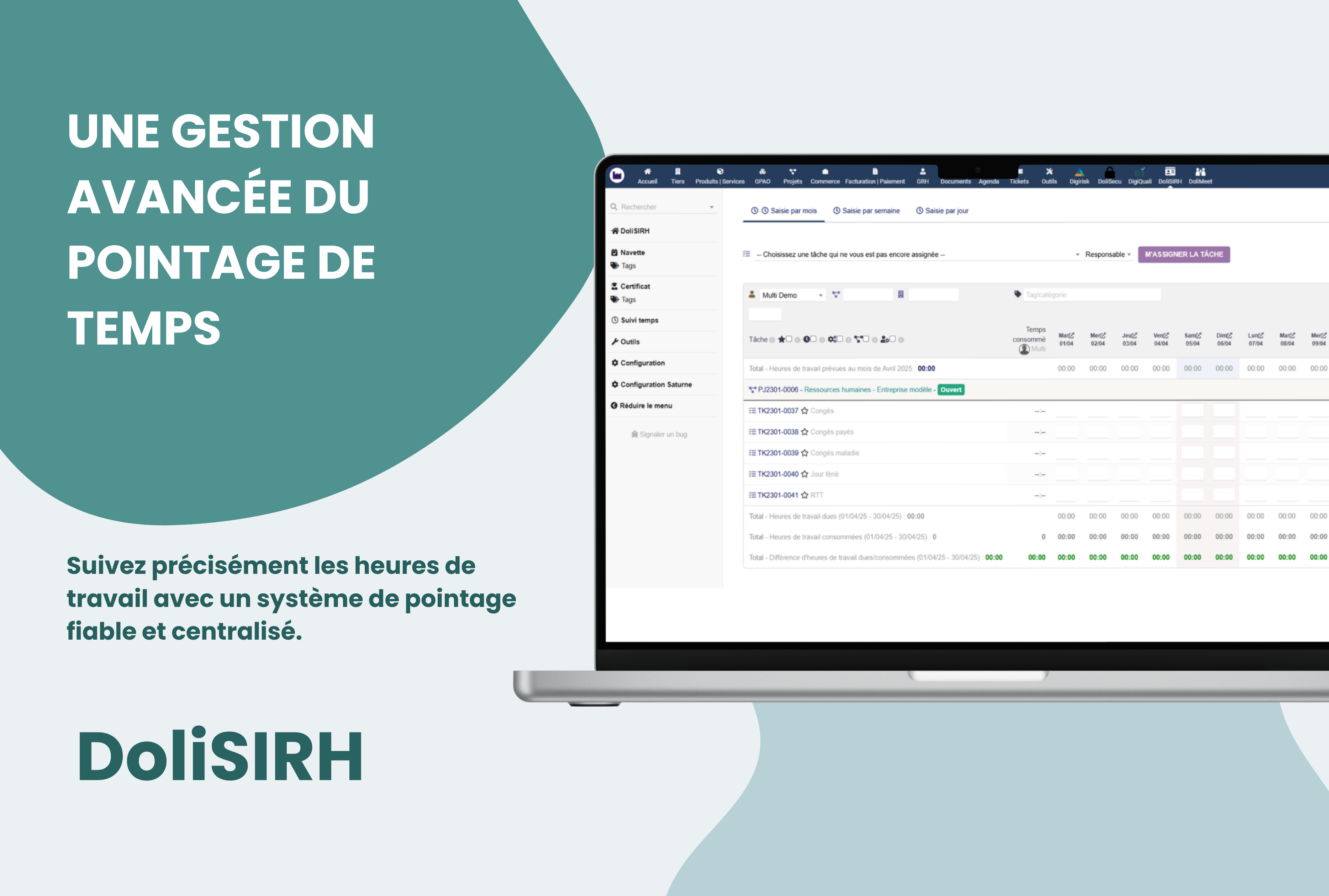 DoliSIRH es un módulo para la gestión avanzada del seguimiento del tiempo que permite generar informes de tiempo mensuales, semanales y diarios.