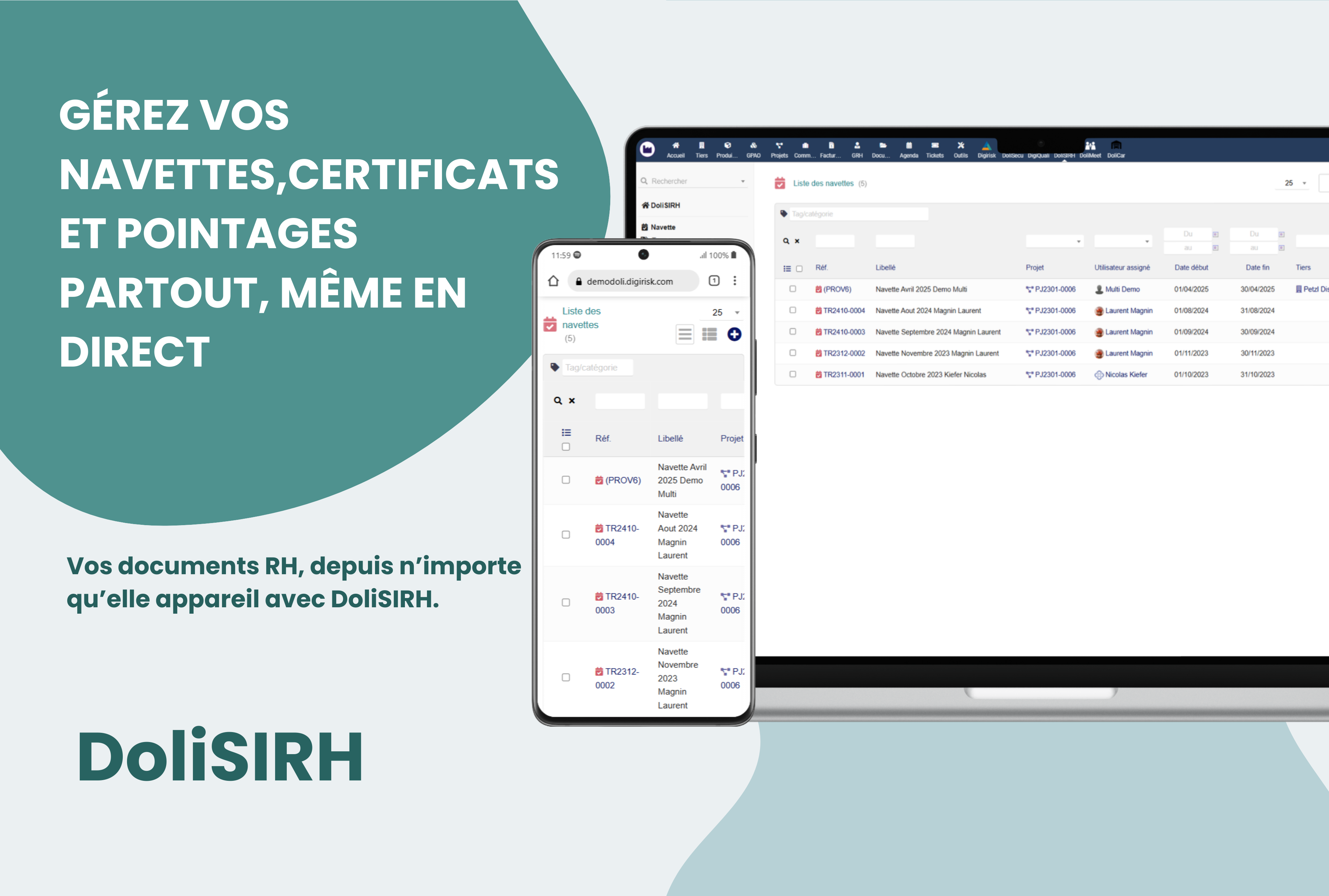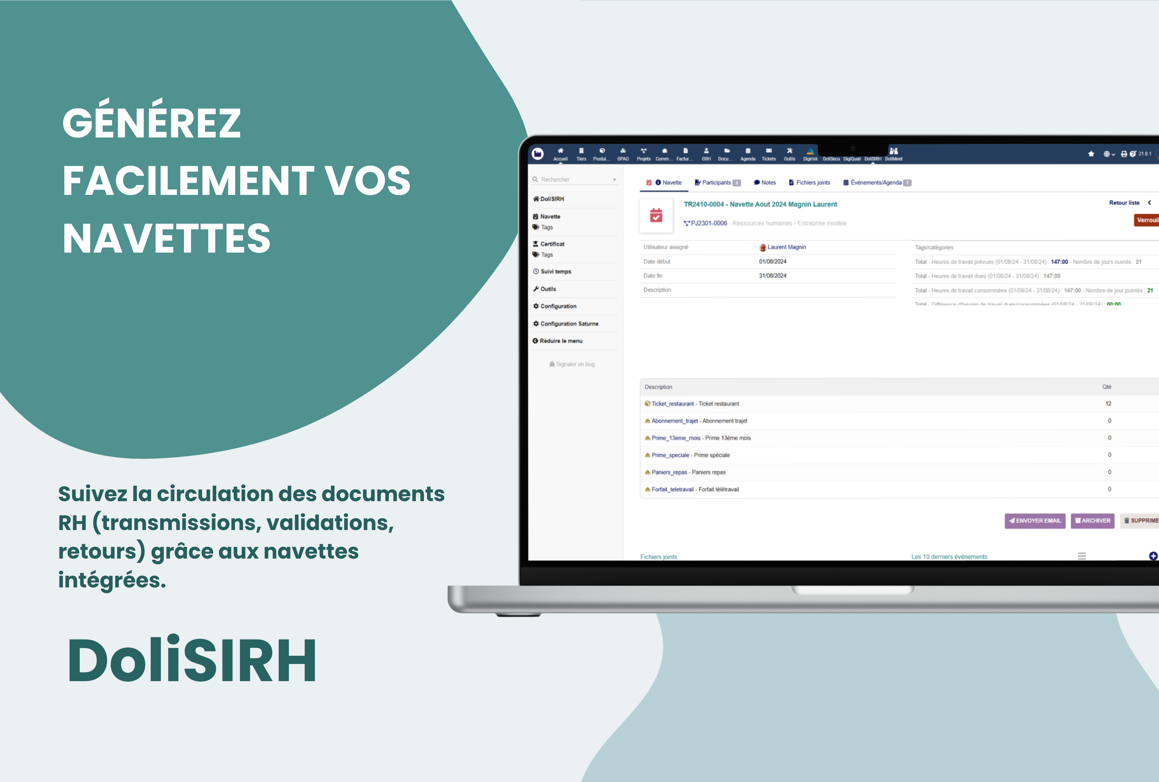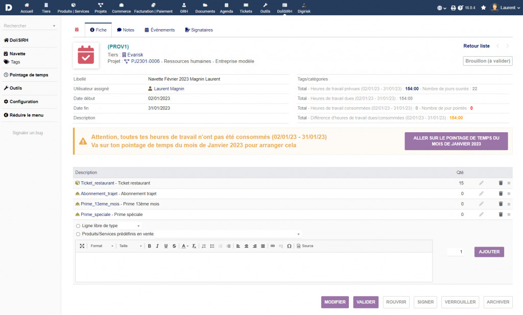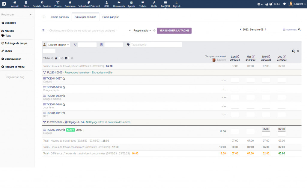 DoliSIRH es un módulo para la gestión avanzada del seguimiento del tiempo que permite generar informes de tiempo mensuales, semanales y diarios.
