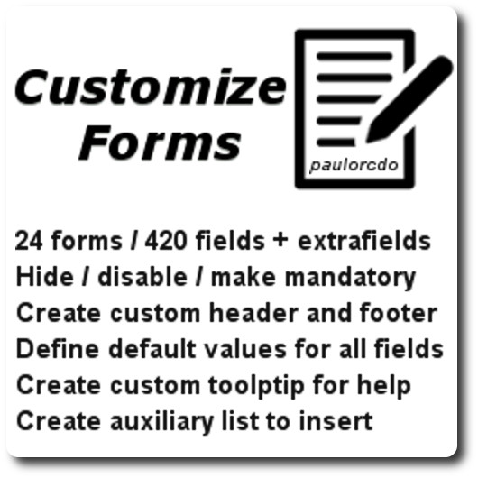 Personalice formularios: cree nuevas funciones en 24 formas de dolibarr, más de 430 campos estándar y todos los campos adicionales. Oculte, requerido, Deshabilitar, información sobre herramientas, etiquetar y establecer valores predeterminados para los campos. Cree listas auxiliares de textos y frases preformateadas para insertarlas fácilmente en los campos.