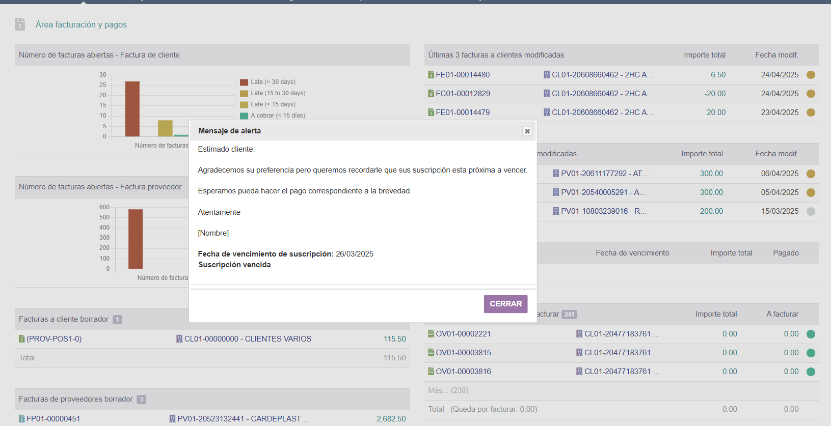 Affiche des messages d’alerte personnalisables sur l’expiration d’abonnement à la connexion, dans TakePOS et dans le module Financier.