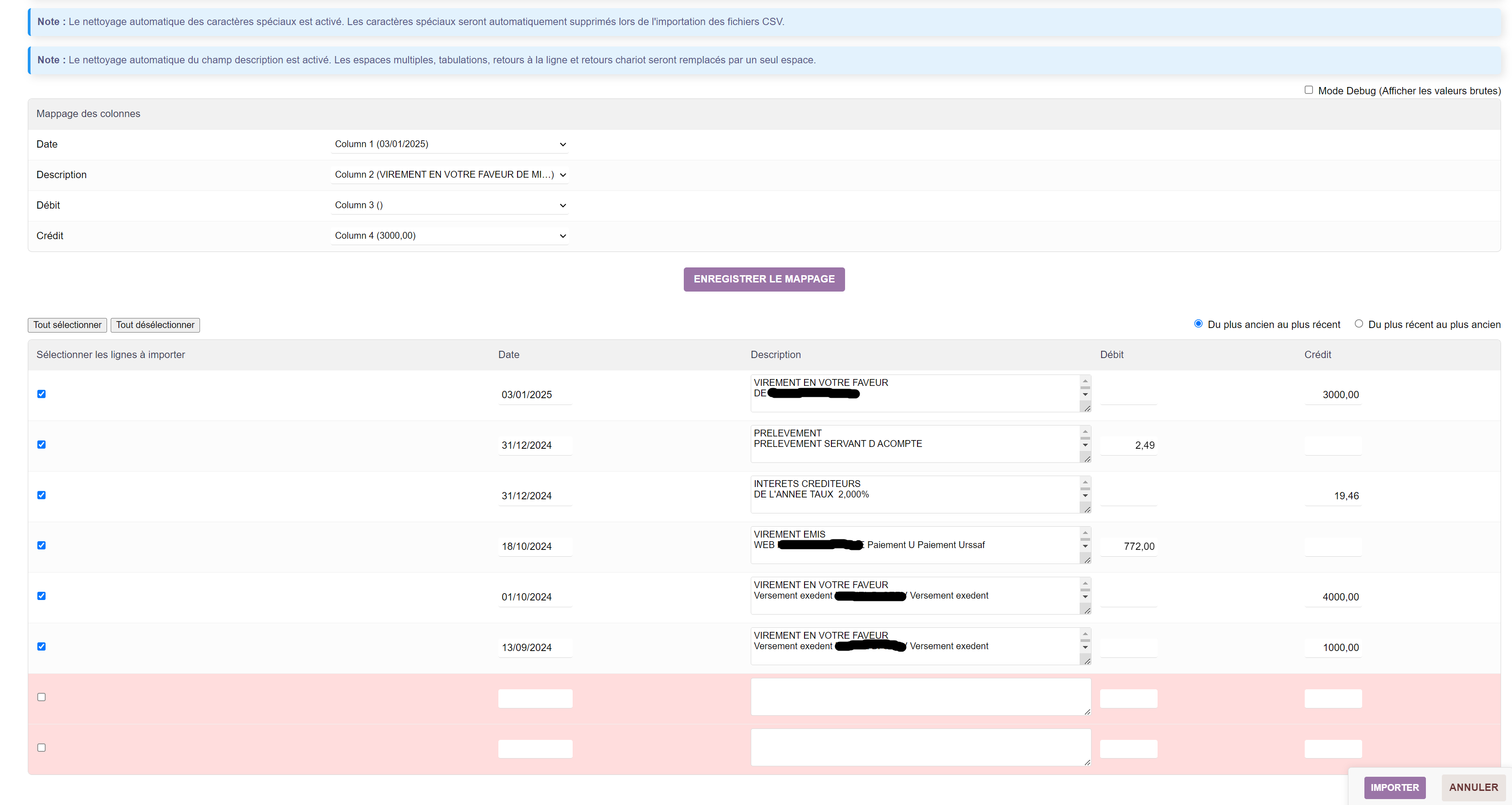 - Mappage intelligent des colonnes pour la date, la description, le débit et le crédit