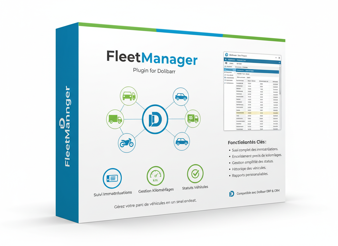 FleetManager ermöglicht Ihnen die Verwaltung Ihres Fuhrparks in Dolibarr. Verfolgen Sie Ihre Kennzeichen, Kilometerstände und Status an einem Ort.