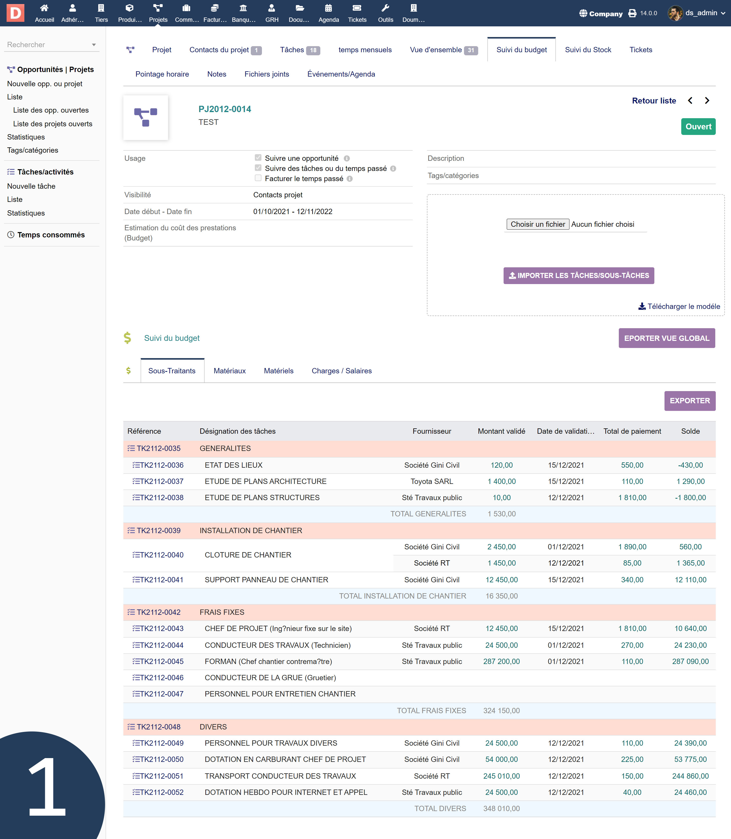This module adds a real budget dashboard to Dolibarr for your construction projects. Directly from the project card, you can monitor in real time the detailed budget by tasks, subcontractors, materials, equipment and charges/salaries, with a clear view of validated amounts, payments made and remaining balances.