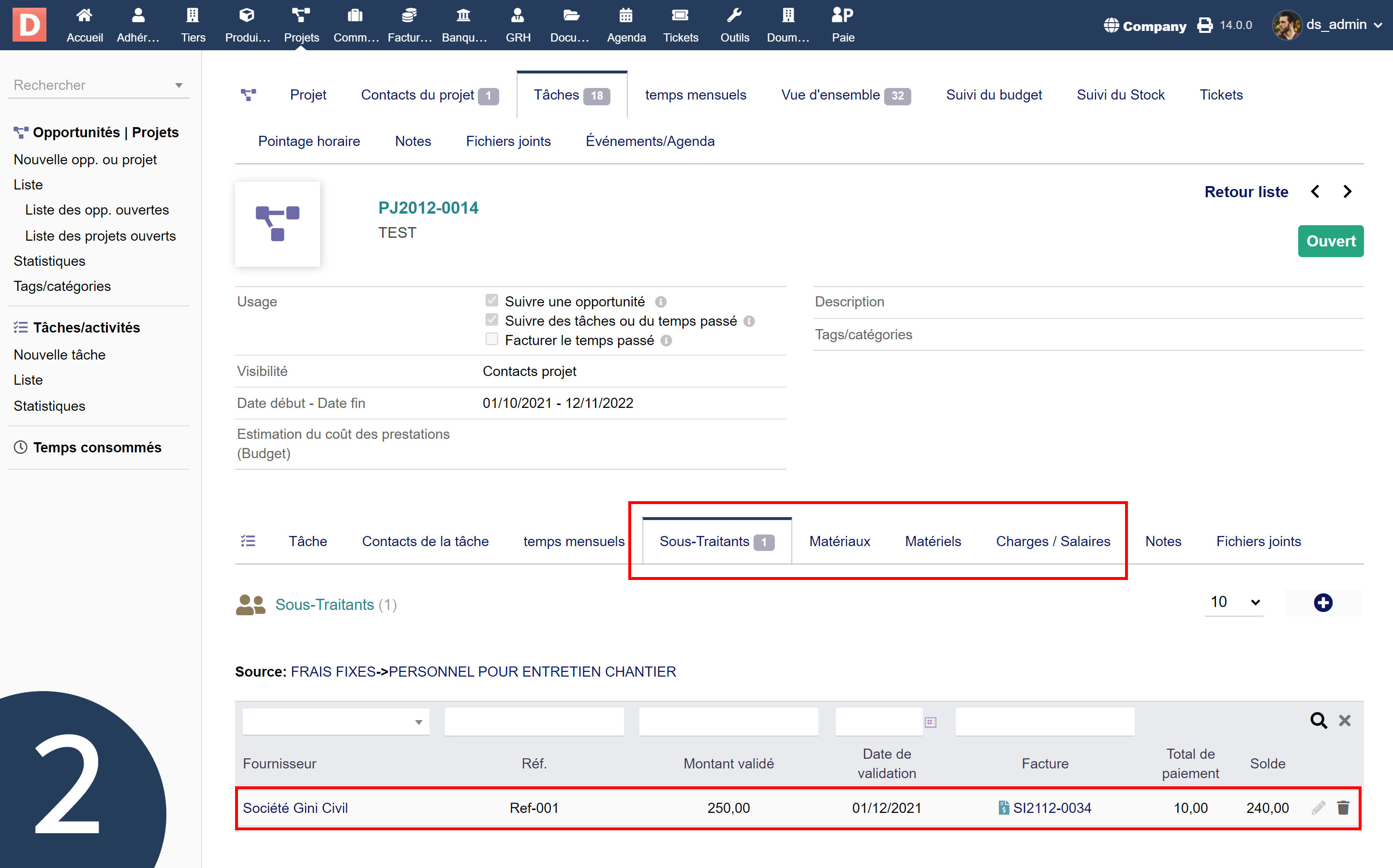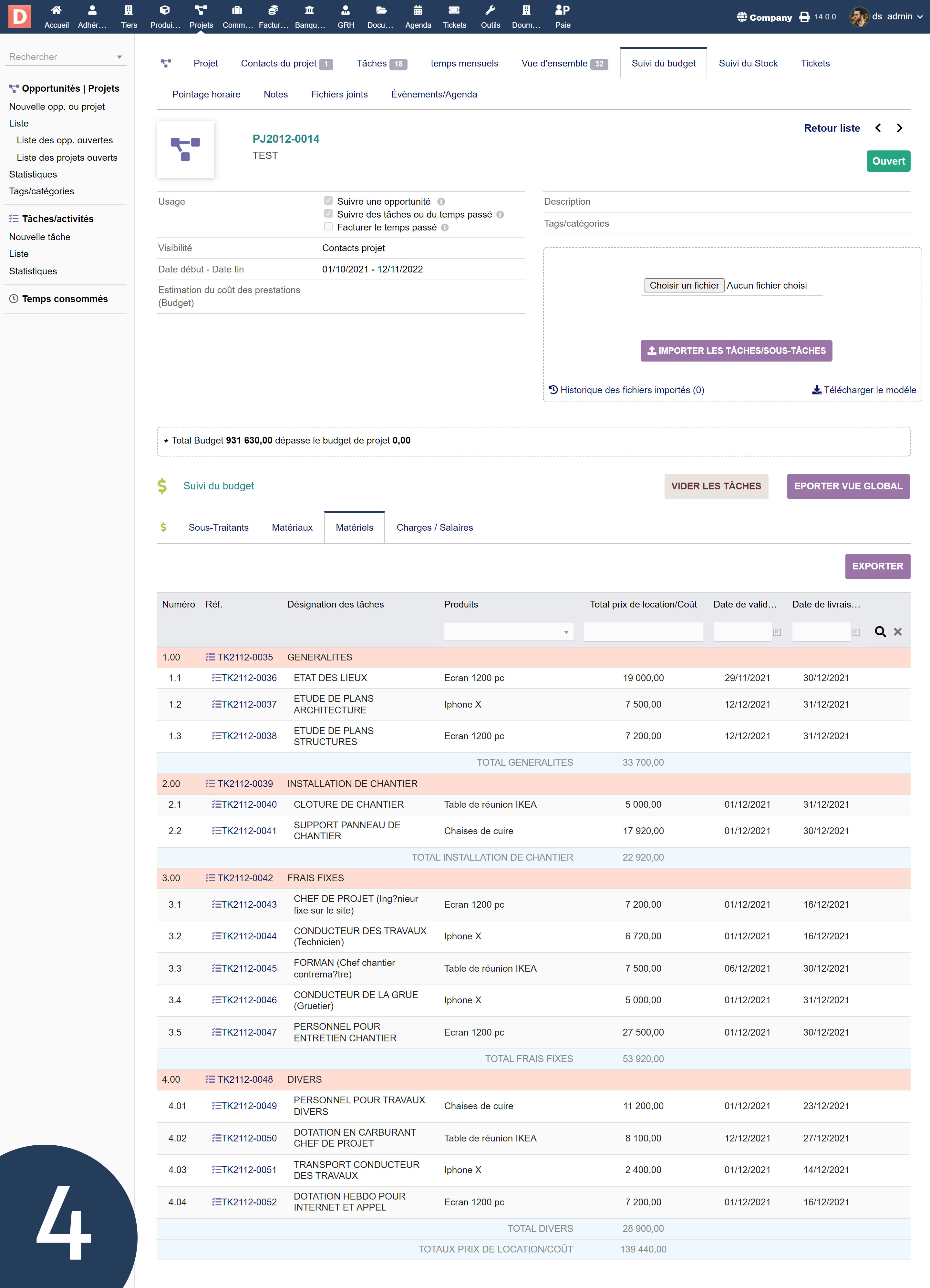 Based on the project task structure (WBS), the module lets you import or enter a detailed budget and then split it into four main cost families: subcontractors, materials, equipment and charges/salaries. Each task line is linked to a supplier, a product or an internal resource, which makes it easy to reconcile with invoices, stock movements and payroll.