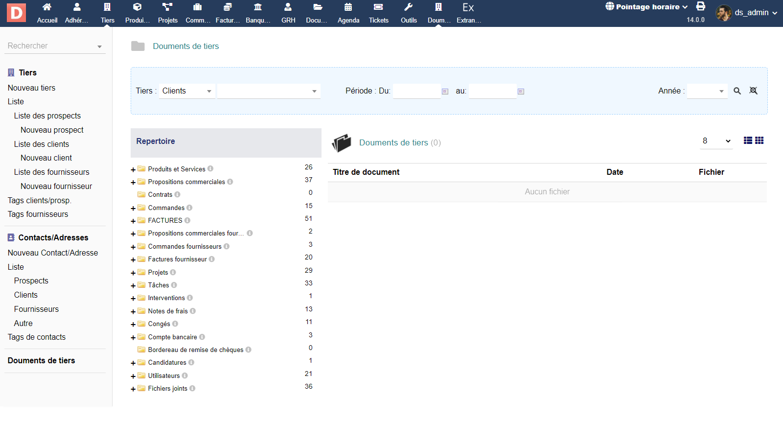 Nel menu “Terzi > Documenti di terzi” si seleziona il tipo di terzo (clienti, fornitori, prospect, ecc.) ed eventualmente un periodo o un anno. A sinistra compare una struttura ad albero con le diverse entità di Dolibarr e il numero di file collegati: