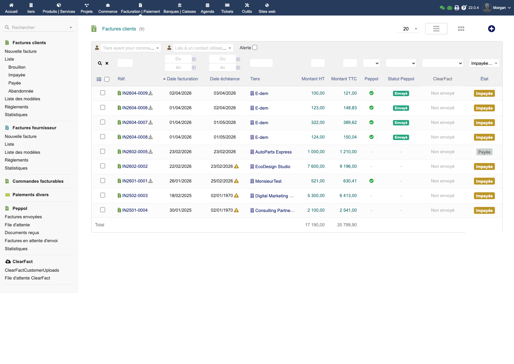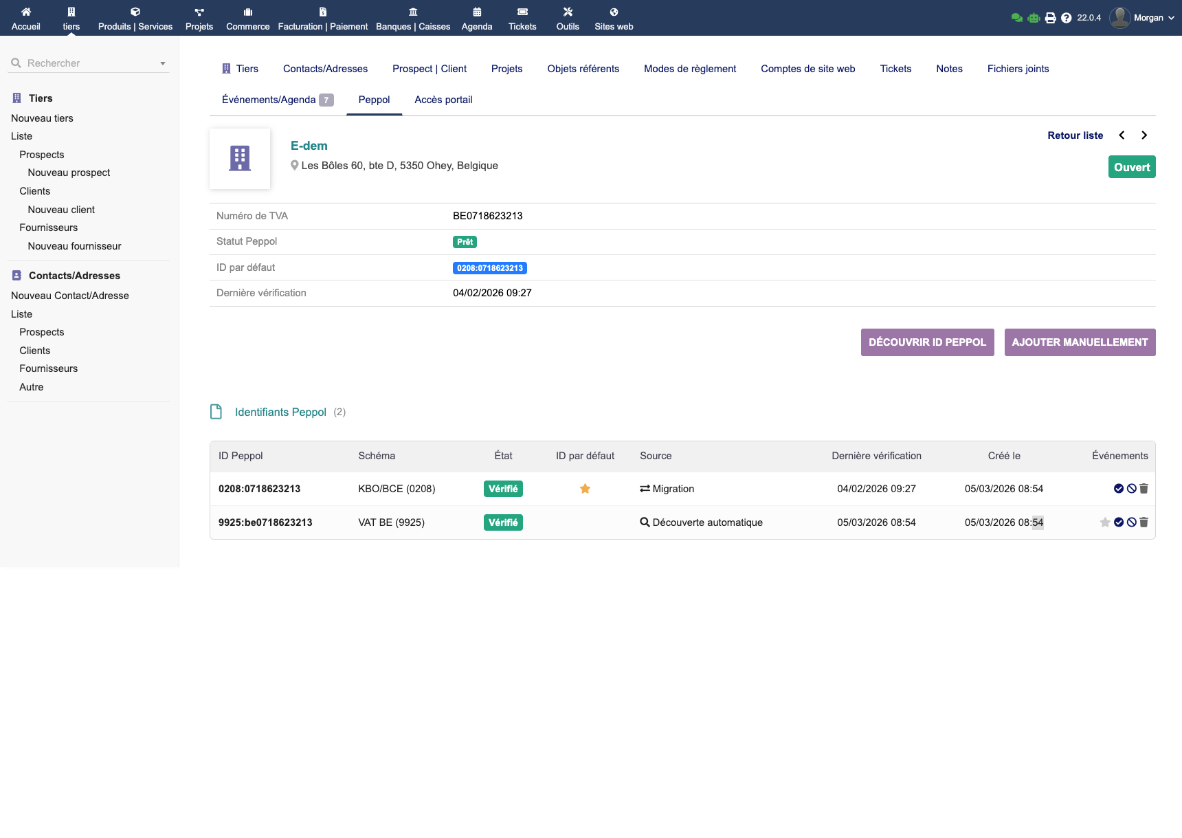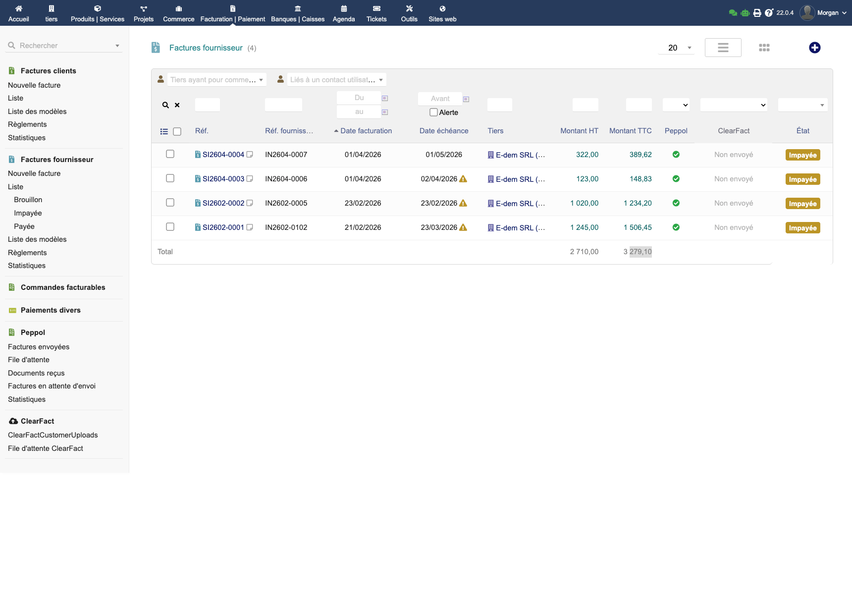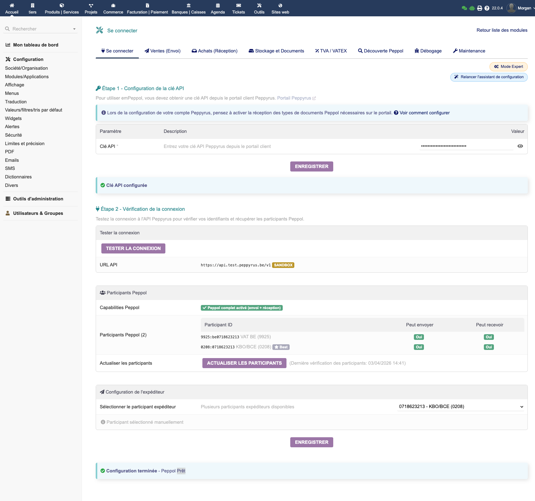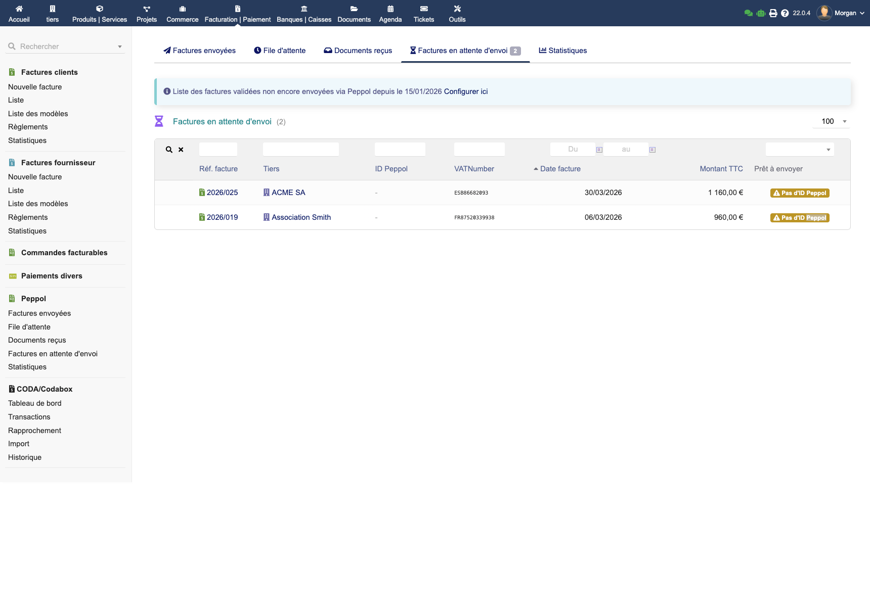 Facturation électronique Peppol complète pour Dolibarr. Envoyez et recevez vos factures UBL via Peppyrus. Aucun abonnement, envoi et réception illimités. Conforme EN 16931 & Peppol BIS 3.0. Messagerie Peppol (accusé, acceptation, refus, paiement), codes VATEX, QR code paiement, multi-ID Peppol, wizard d'installation, mode simple ou expert. Compatible Multicompany.