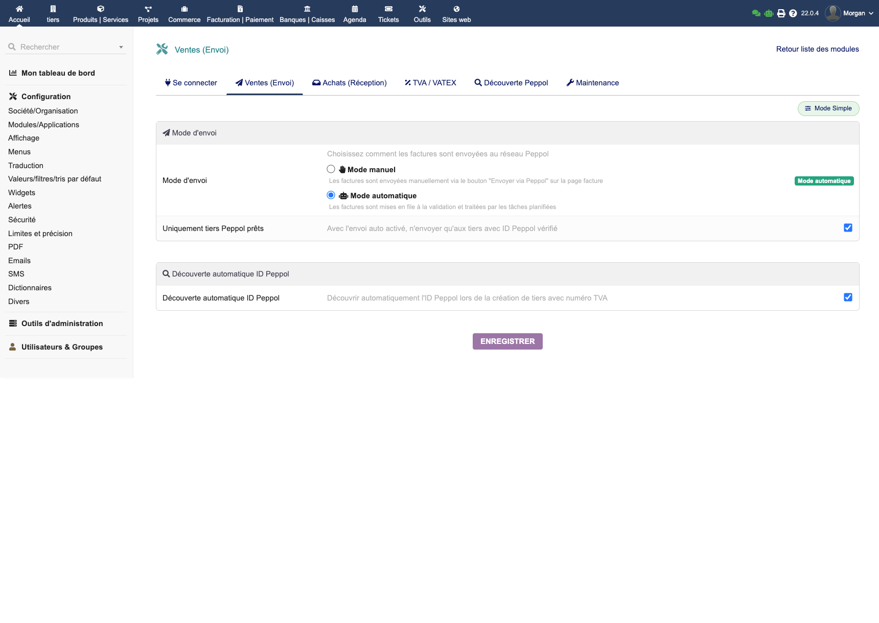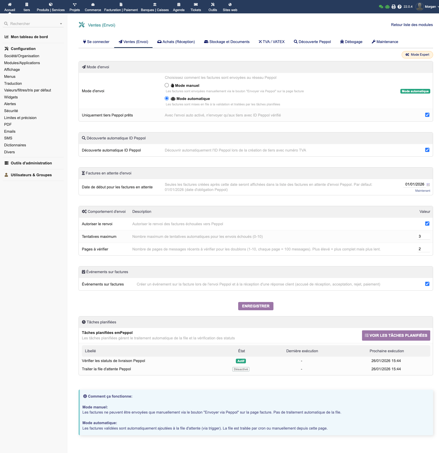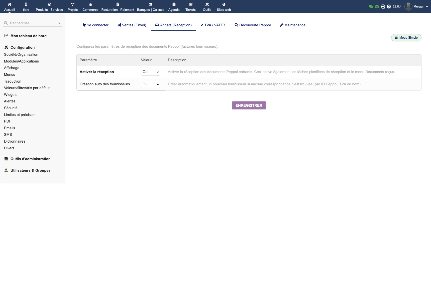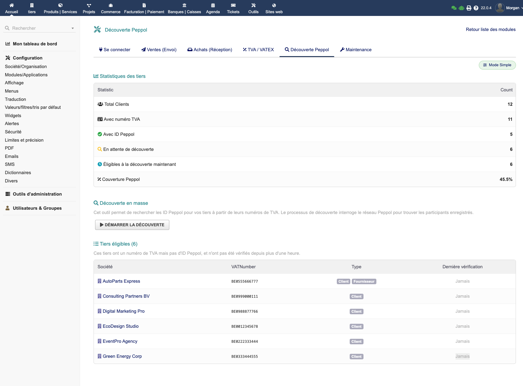 Le module EMPeppol connecte votre Dolibarr au réseau européen Peppol via Peppyrus. Il génère des factures UBL conformes aux standards EN 16931 et Peppol BIS 3.0, avec envoi en un clic, réception automatique des factures fournisseurs, découverte automatique des identifiants Peppol, suivi des statuts en temps réel et journaux d'audit complets.