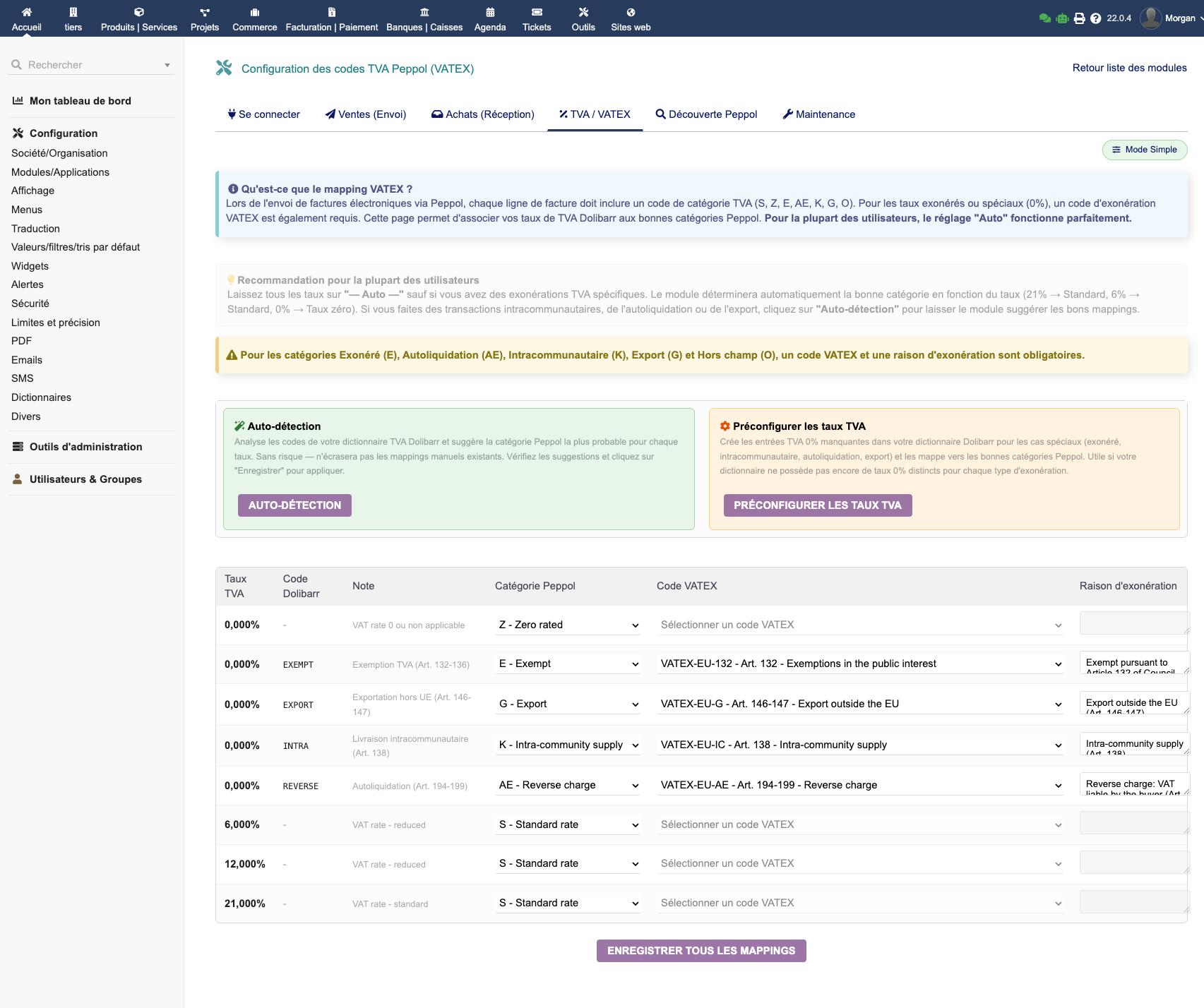 Gestion complète des codes VATEX (VAT Exemption) pour la facturation électronique Peppol :