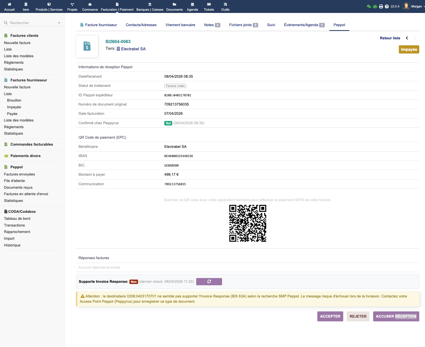 Pour les factures d'achat reçues contenant des informations de paiement, un QR code est affiché dans l'onglet Peppol. Scannez-le pour payer rapidement, avec prise en charge des communications structurées.