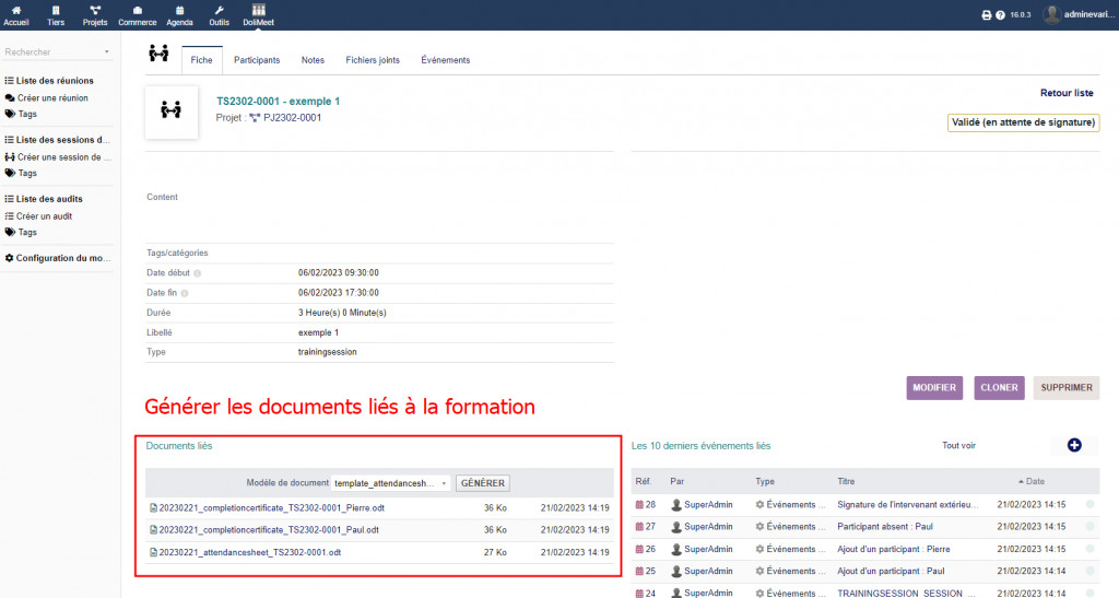 Mit DoliMeet können Sie folgen:meetings und Protokolle, schulungen mit Teilnahme- und Leistungsnachweis, audits mit dem Bericht