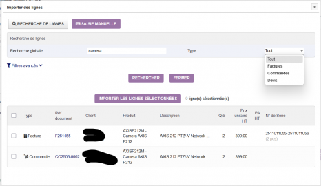 Intelligent import of lines between commercial documents (invoices, orders, quotes) with multi-criteria search, manual import and margin management.