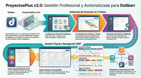 Gestión profesional de proyectos con wizard de creación guiada, plantillas sectoriales, panel lateral AJAX, tablero Kanban y campos personalizados por categoría. Crea proyectos completos con tareas automáticas en segundos.