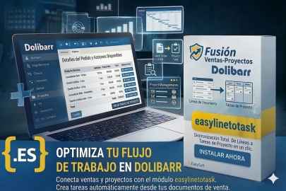 Crea tareas de proyecto directamente desde las lineas de presupuestos, pedidos de cliente y facturas. Cada linea puede vincularse a un proyecto diferente con selector nativo de Dolibarr, visualizacion en documento y PDF.