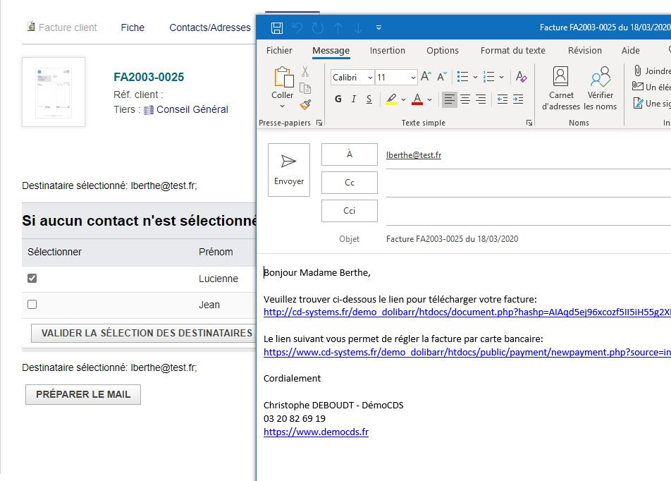 Dolibarr Outlook (& co) permet de s'affranchir de ces problématiques. Un onglet apparait dans les pages "devis" et "factures". A partir de cet onglet, Outlook ou tout autre logiciel de messagerie s'ouvre le mail prérempli. L'adresse mail par défaut du client, le titre, le corp du message, le lien vers le devis ou la facture, et le lien pour effectuer le règlement (en cas d'utilisation du module Stripe, Paypal, etc..) sont déjà remplis, il suffit d'appuyer sur "Envoyer".