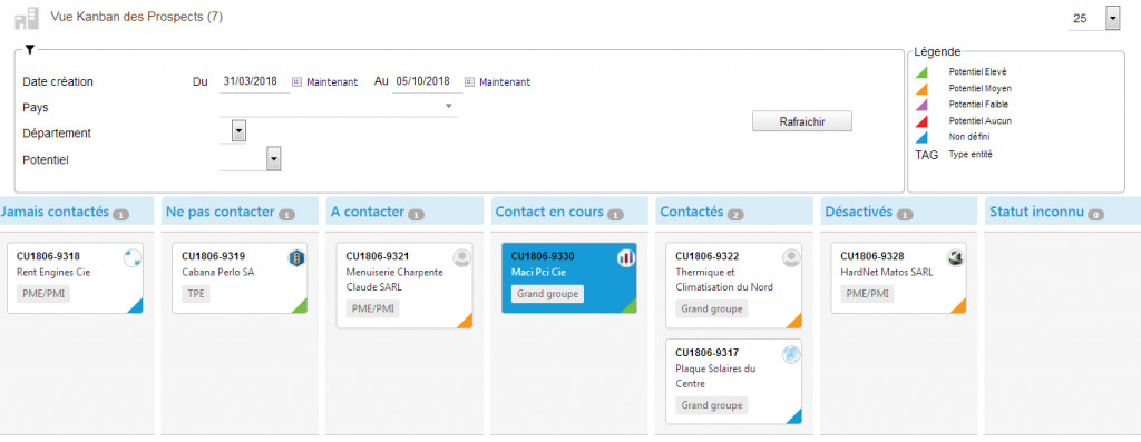 Le module Dolibarr KanProspects permet de visualiser vos Prospects sous format Kanban pour les états : A contacter, Contact en cours, ... L'état d'un prospect peut être modifié par Glisser/Déposer d'une colonne à l'autre. Cette vue Kanban est filtrable (par Date création, Pays, Département, Potentiel) et imprimable (par click droit sur le titre d'une colonne Kanban)