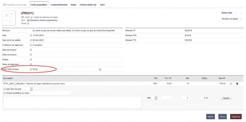 The Total Weight Quotation module displays the total weight of the products added to the quotation on the quotation entry screen.
