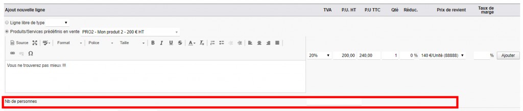 Le module ajoute un champ pour chaque produit/service sur vos devis, factures et commandes pour multiplier le prix selon le nombre de participants, le nombre de jours, … Vous personnalisez ce champ et gérez vos devis au plus proche de votre activité !
