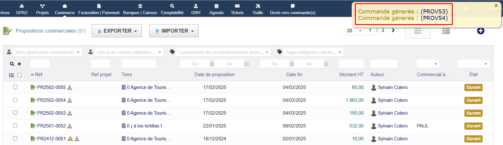 Le module « Génération massive de commandes » vous permet de convertir en masse vos propositions commerciales en commandes. Il offre la possibilité de transformer plusieurs devis en plusieurs commandes distinctes ou de regrouper plusieurs devis d'un même client en une seule commande. Un gain de temps précieux pour optimiser votre gestion commerciale !