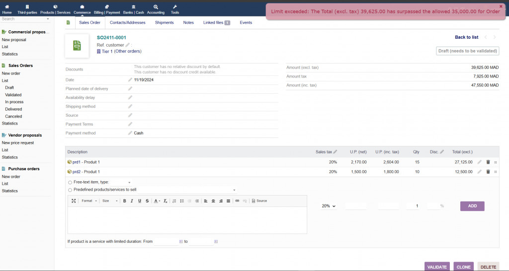 Module to limit invoices, orders, or proposals by amount