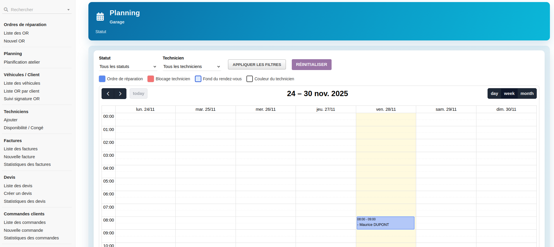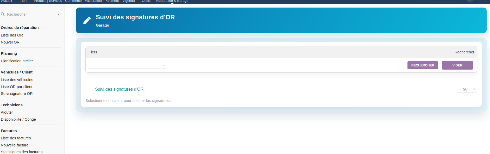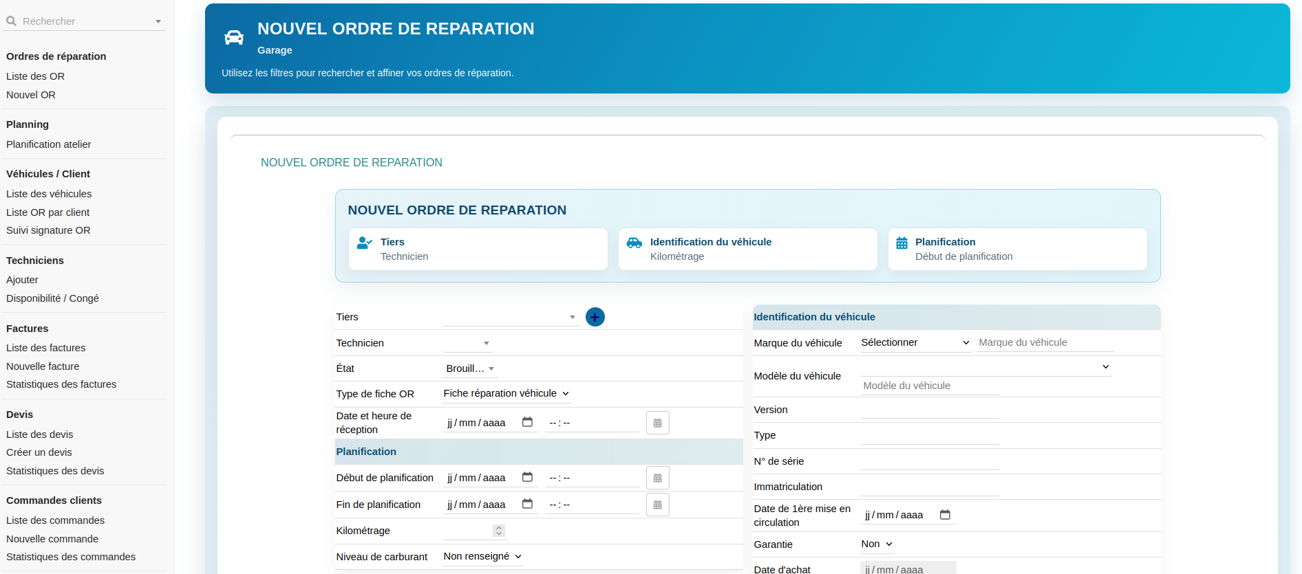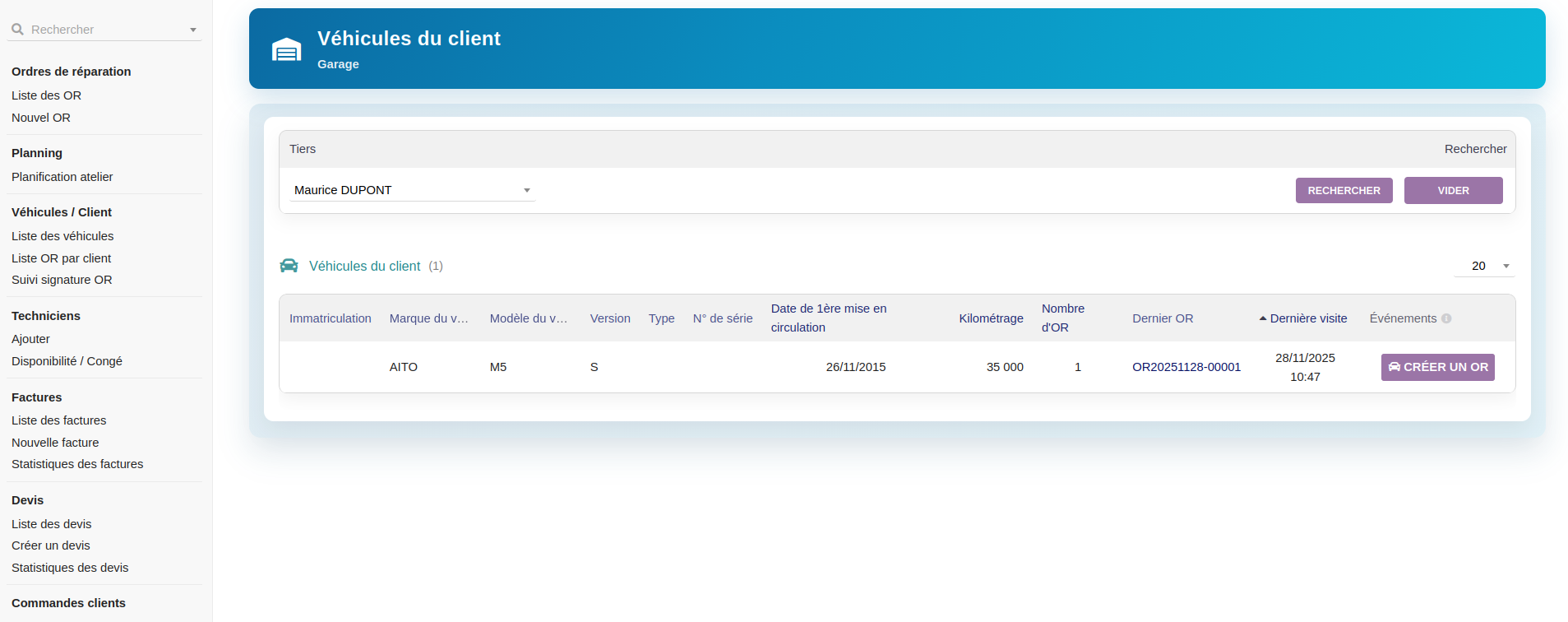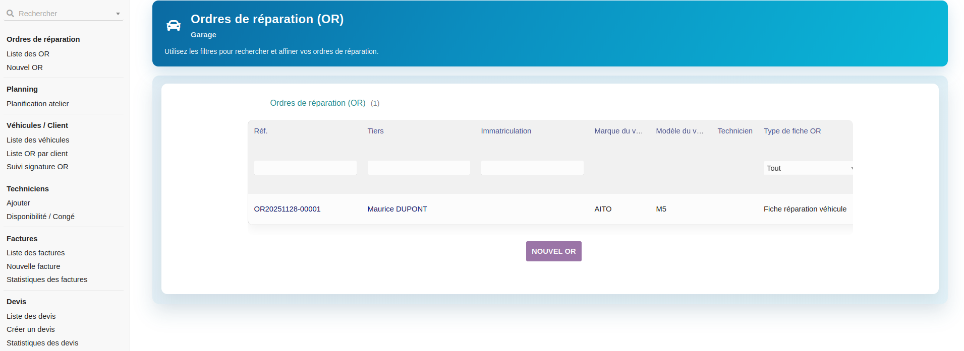 Vea el menú “Service Garage / OR” en Dolibarr.