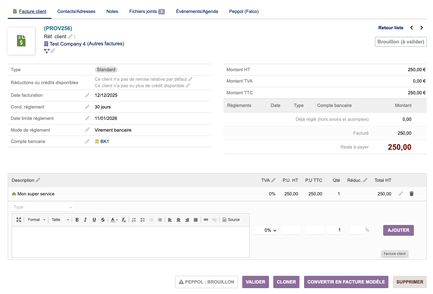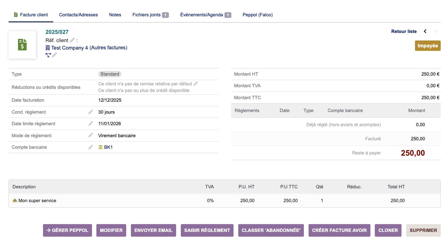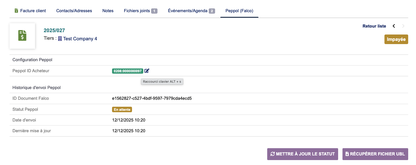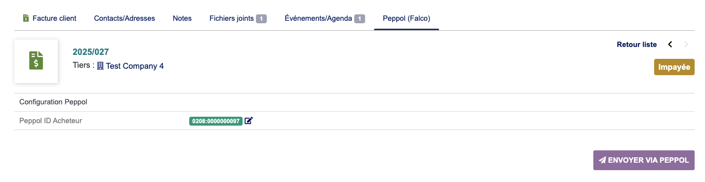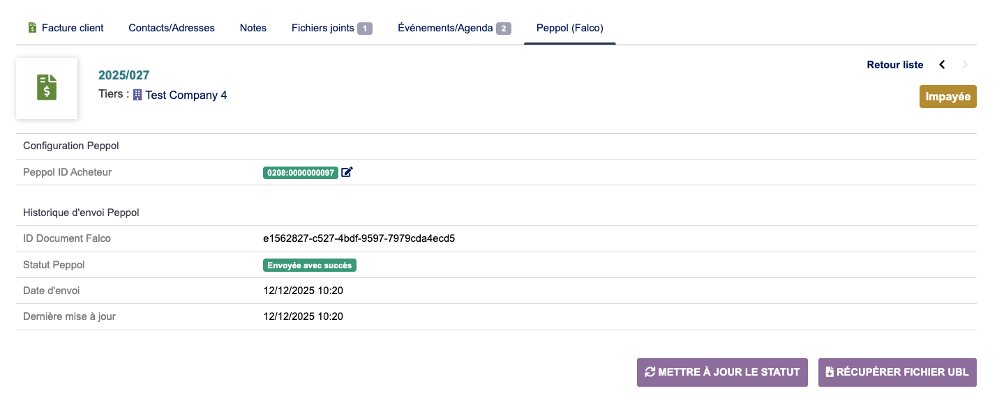 - Onglet Peppol sur les factures (historique, statut, envoi)