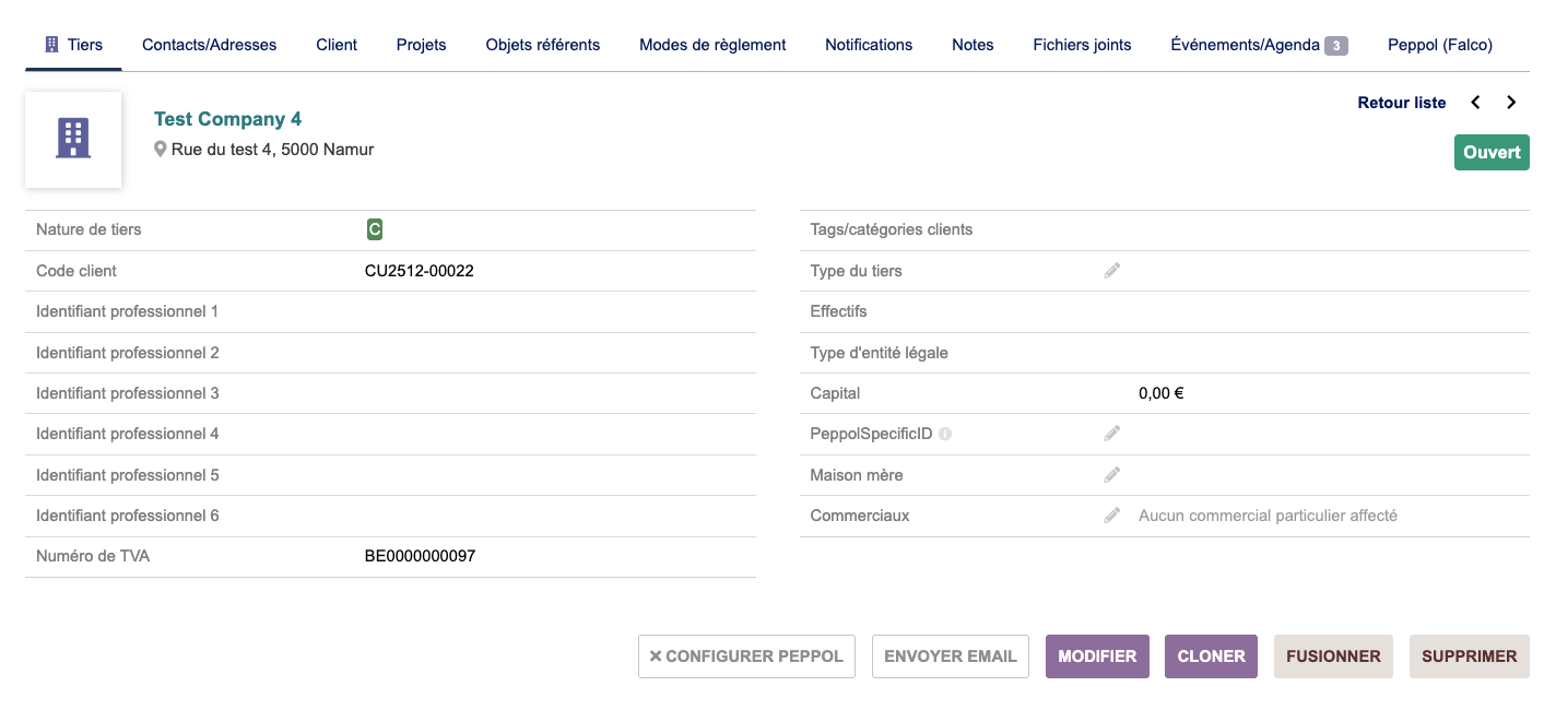 - Onglet Peppol sur les fiches clients (ID, statut, boutons d’action)