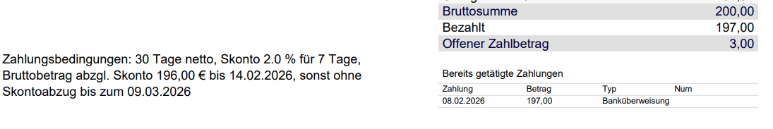 Automatic display of payment terms including discount on: Quotes, Orders, Invoices