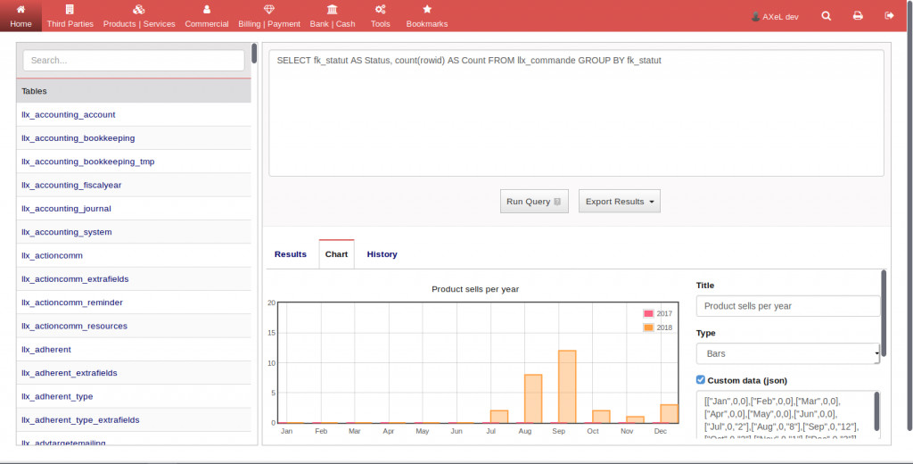 Generate graphs from SQL queries and export your data to PDF or CSV format.