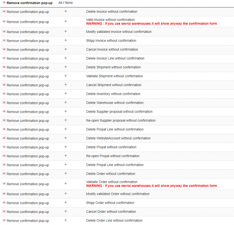 Module that allows admin to remove some confirmation pop-up for specific users. By default nothing is removed for users and needs to activate removal on users permissions. For admin user, removal is done by default.