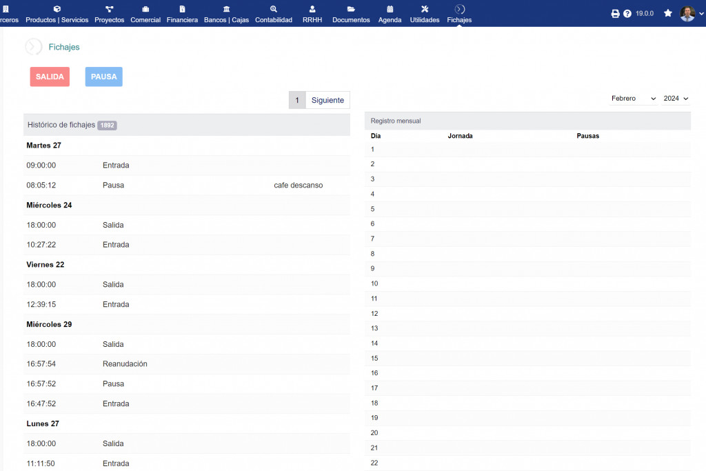 FICHAJES is a complete SOLUTION to keep track of the hours worked by employees, and in a simple and automated way, you can perform the following operations: ENTRY, PAUSE, EXIT.